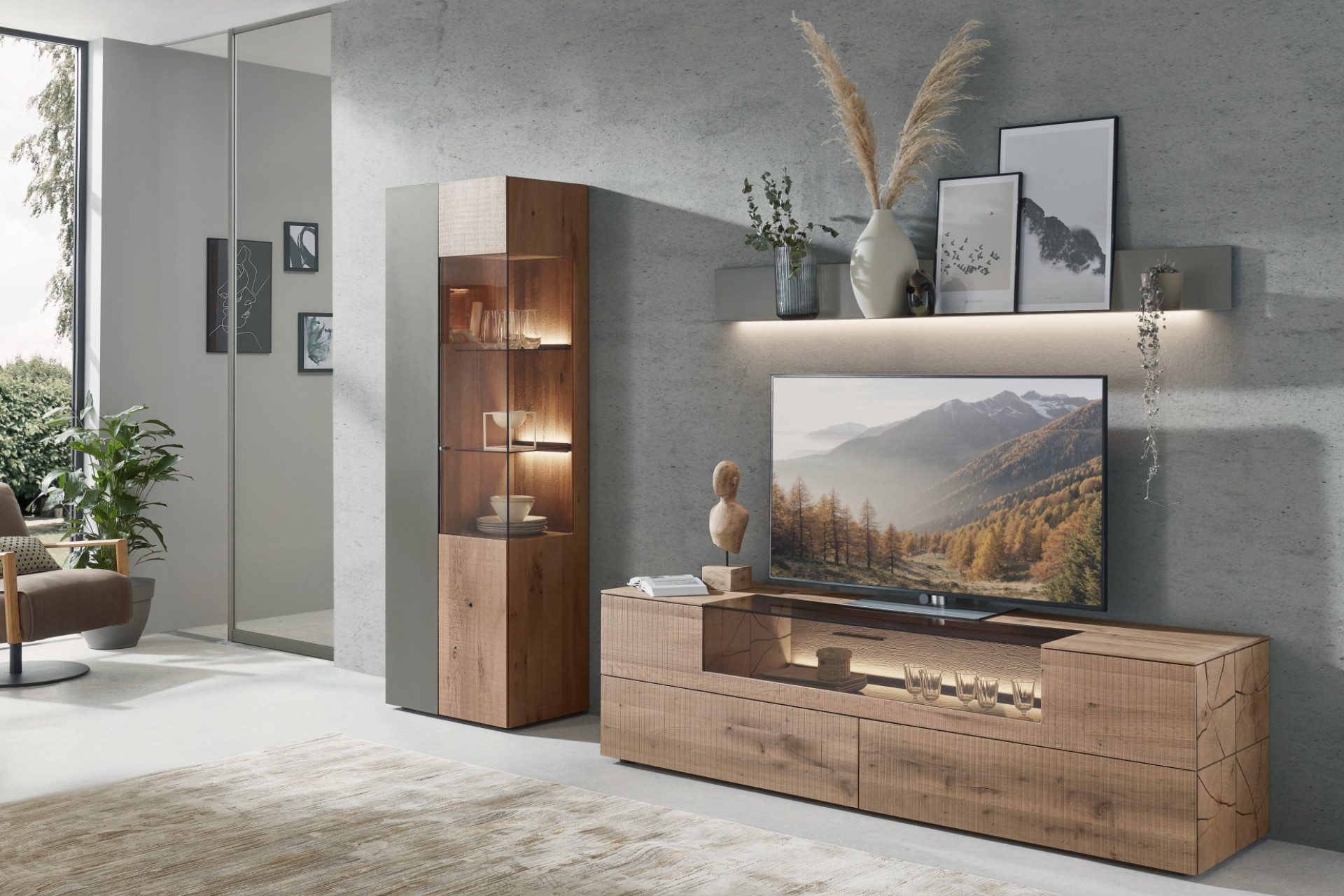 Holz gehört zu den schönsten Wohn-Materialien, die uns die Natur zu bieten hat. Entsprechend beliebt ist es auch beim Einrichten des Wohnbereichs. Vom Boden bis zu Decken- oder Wandpaneelen gibt es viele Wohnzimmer-Ideen, wie Holz in den Raum integriert werden kann. Die beliebteste und einfachste Möglichkeit sind und bleiben jedoch Holzmöbel. Mit ihnen ziehen nicht nur wahre „Klima-Profis“ ein (dazu gleich mehr), sondern auch optisch wertet Holz Wohnzimmer auf. Ob skandinavisch-elegant oder urwüchsig-rustikal: Auch die Stil-Facetten des Materials sind je nach Holzart, Verarbeitung und Kombination überaus vielseitig. Ein Mix mit Hochglanz, Mattlack, Glas oder Metall lässt im Wohnzimmer selbst Massivholz modern und leicht aussehen.