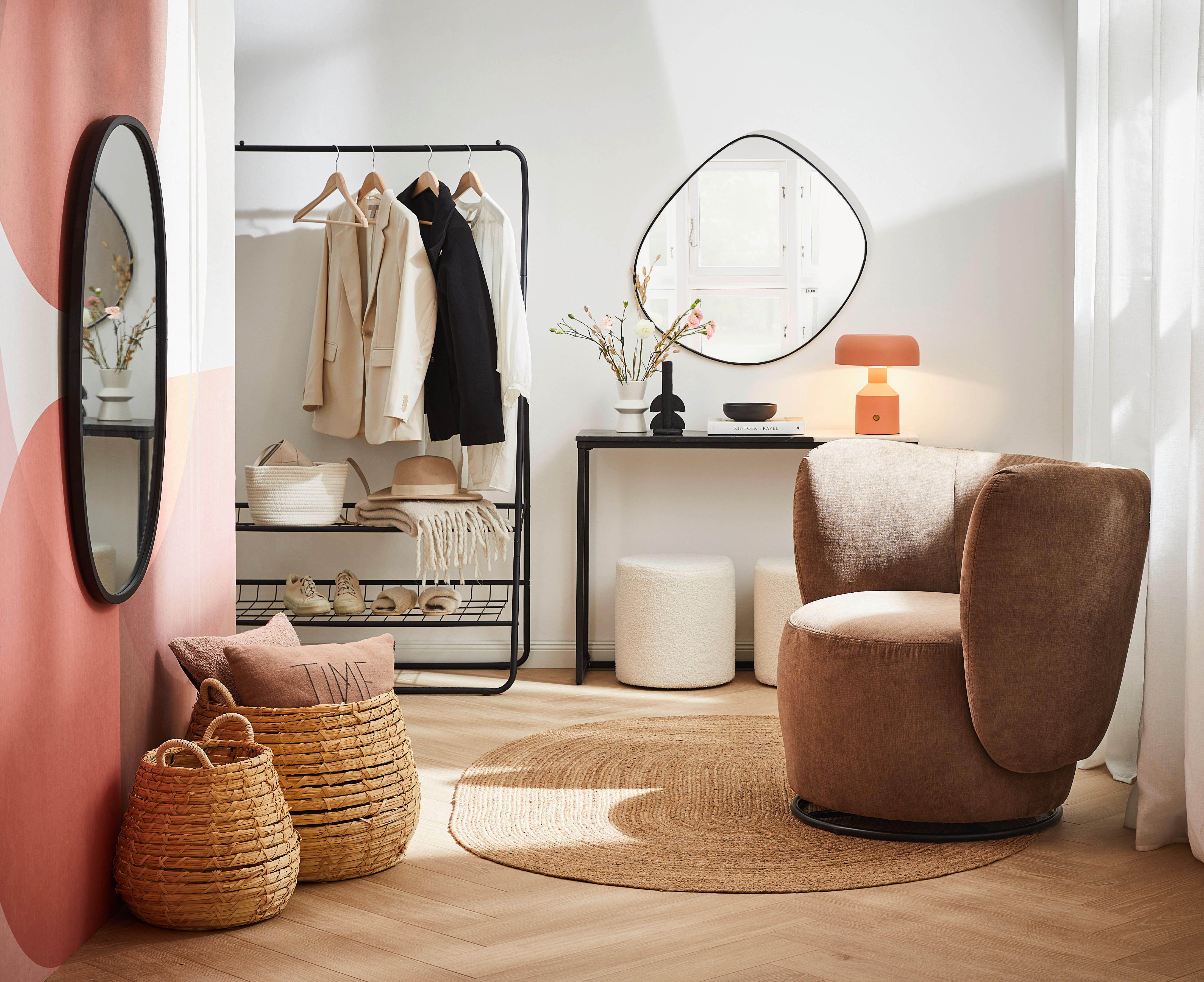 Wer nicht auf einen wuchtigen Schrank setzen möchte, gerne zeigt, was er hat und außerdem ein offenes Flair bevorzugt, der wählt eine Kleiderstange zur Präsentation von Hemden, Blusen und Co. Ob das Outfit gefällt, überprüfen Sie in einem Wandspiegel, der mit einer schnörkellosen, auf das Wesentliche reduzierten Formensprache überzeugt. Auch bei den Leuchten gilt: Weniger ist mehr. So passen etwa Leuchtmittel im Glühbirnen-Design in einer minimalistischen schwarzen Fassung ausgezeichnet in ein Schlafzimmer im Industrial Style. Zu guter Letzt runden Sie den Fabrik-Charme mit geeigneten Textilien wie farblich abgestimmten Kissen, Tagesdecken und Teppichen harmonisch ab.