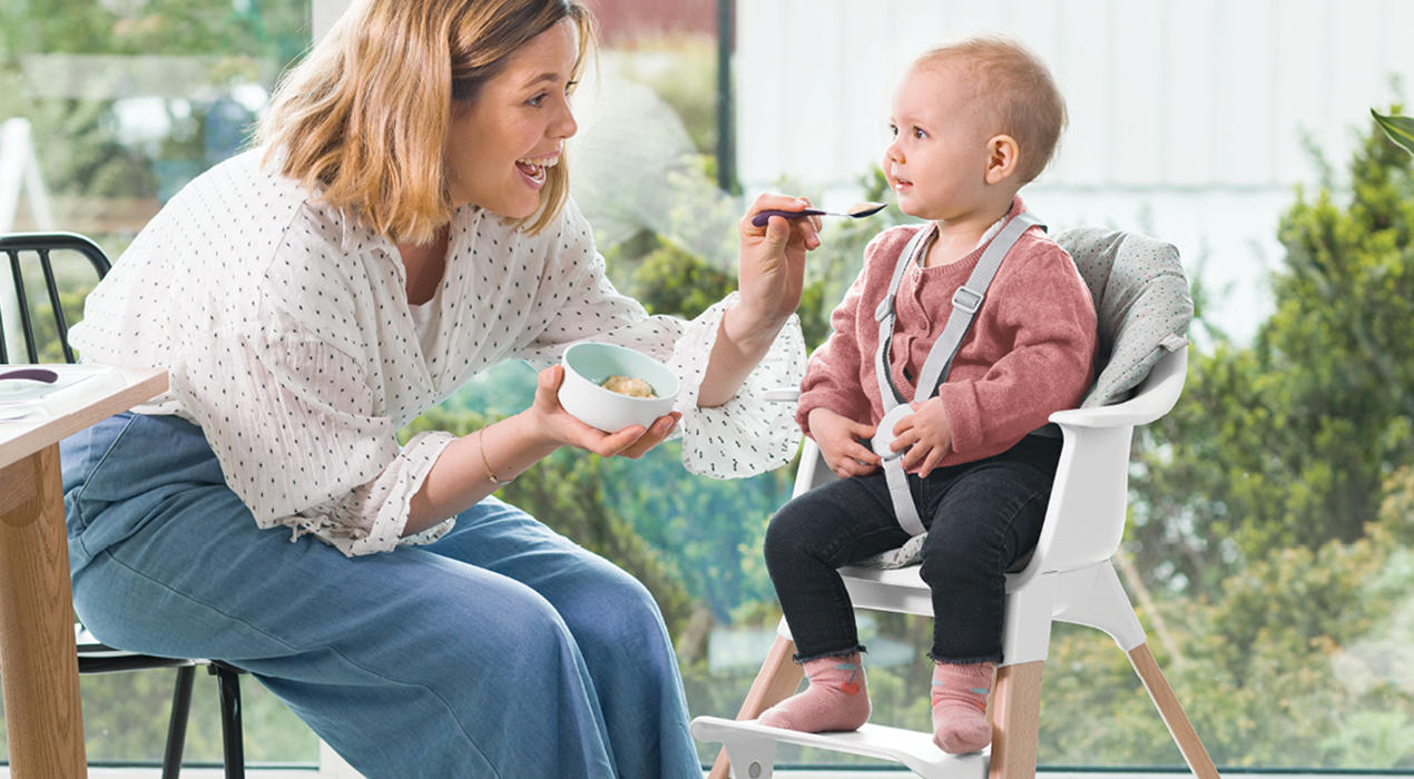 Der STOKKE „Clikk“ bietet Eltern und Nachwuchs alles, um das gemeinsame Frühstück, Mittagessen oder Abendbrot einfach und hygienisch zu gestalten: Der Sprössling sitzt sicher in der Schale mit 5-Punkt-Gurt und der Brei steht auf dem abnehmbaren Tray.