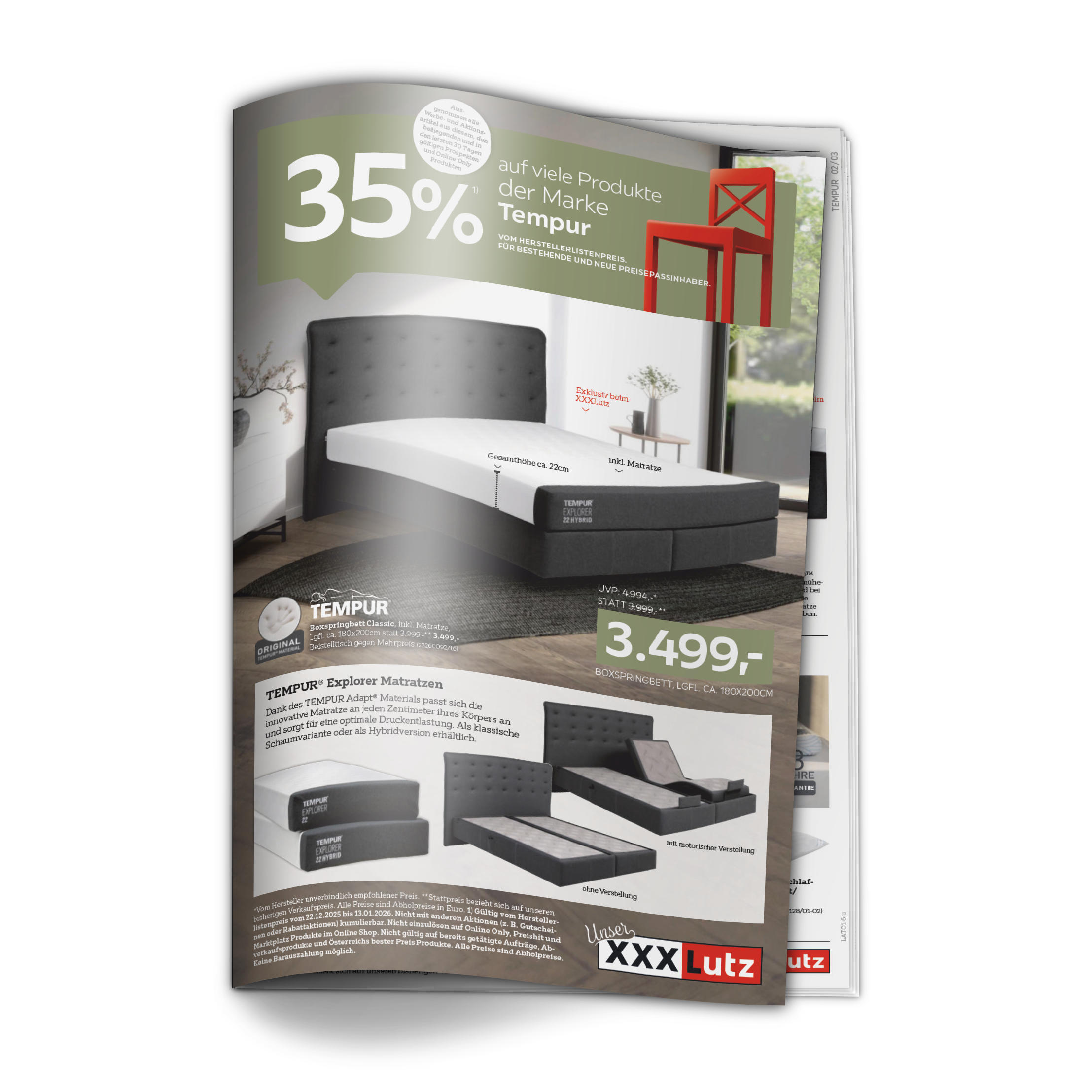 Aktuell, digital und übersichtlich: Von den zahlreichen XXXL Angeboten im aktuellen XXXLutz Flugblatt über den neuesten Saisonkatalog bis hin zu attraktiven XXXL Restaurantgutscheinen finden Sie hier alles, was das Einrichtungsherz begehrt! Einfach unsere XXXLutz Prospekte online durchblättern und bei Bedarf ausdrucken. Sie werden sehen: Unsere Online-Prospekte bieten Ihnen jede Menge Ideen und Inspirationen – darüber hinaus helfen Sie Ihnen, bares Geld zu sparen.