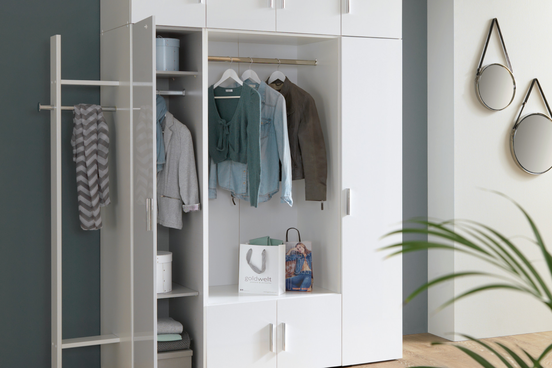 Empfehlenswert ist zudem ein Garderobenschrank mit Spiegel-Einsatz, da die Spiegelflächen das Zimmer optisch vergrößern. Verstärkt wird der Effekt noch, wenn Sie den Spiegelschrank in einem hellen Farbton mit Hochglanz-Finish, welches das einfallende Licht reflektiert, wählen.
