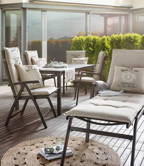 südländisches Flair. Dicke Polster auf dem Sessel und dem Gartensofa machen das Entspannungsgefühl beim Zurücklehnen perfekt.
