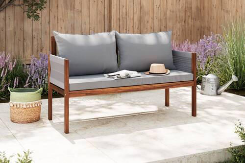 Gartenbänke dar, die in verschiedenen Varianten angeboten werden und auch allein unter einem Baum stehend zum Verweilen einladen.