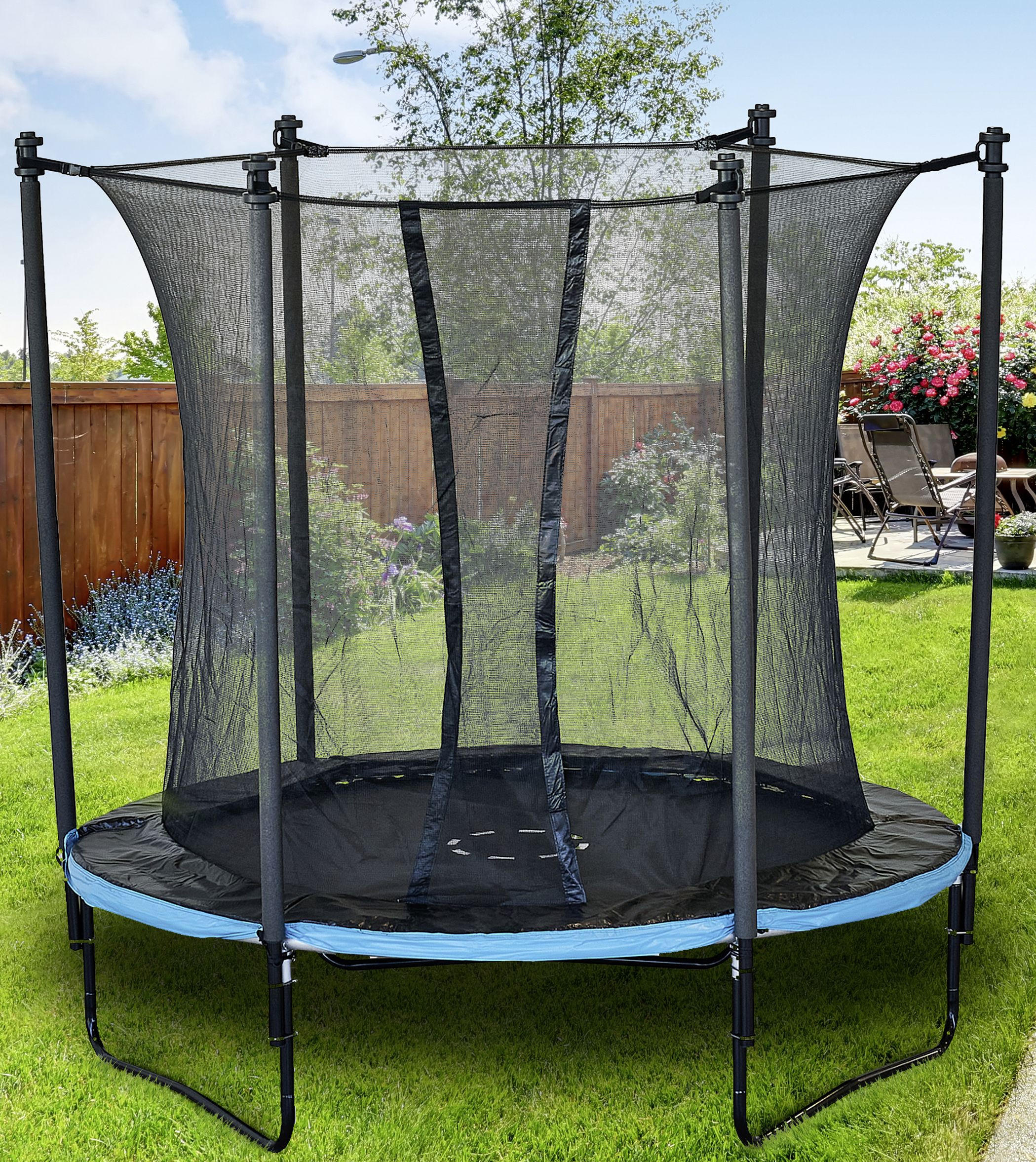 Die Auswahl reicht von kleineren Modellen (ca. 153 x 214 cm) bis hin zu Familien-Ausführungen (ca. 244 x 396 cm). Allen gemein ist ein stabiles Sprungtuch, das mittels mehrerer Federn gespannt wird. Ein gepolsterter Rand deckt diese zuverlässig ab. Viele Versionen verfügen außerdem über ein hohes Sicherheitsnetz aus UV-beständigem, engmaschigem Material. Ein Herausfallen ist dadurch unmöglich, sodass Sie Ihren Racker unbesorgt herumspringen lassen können.