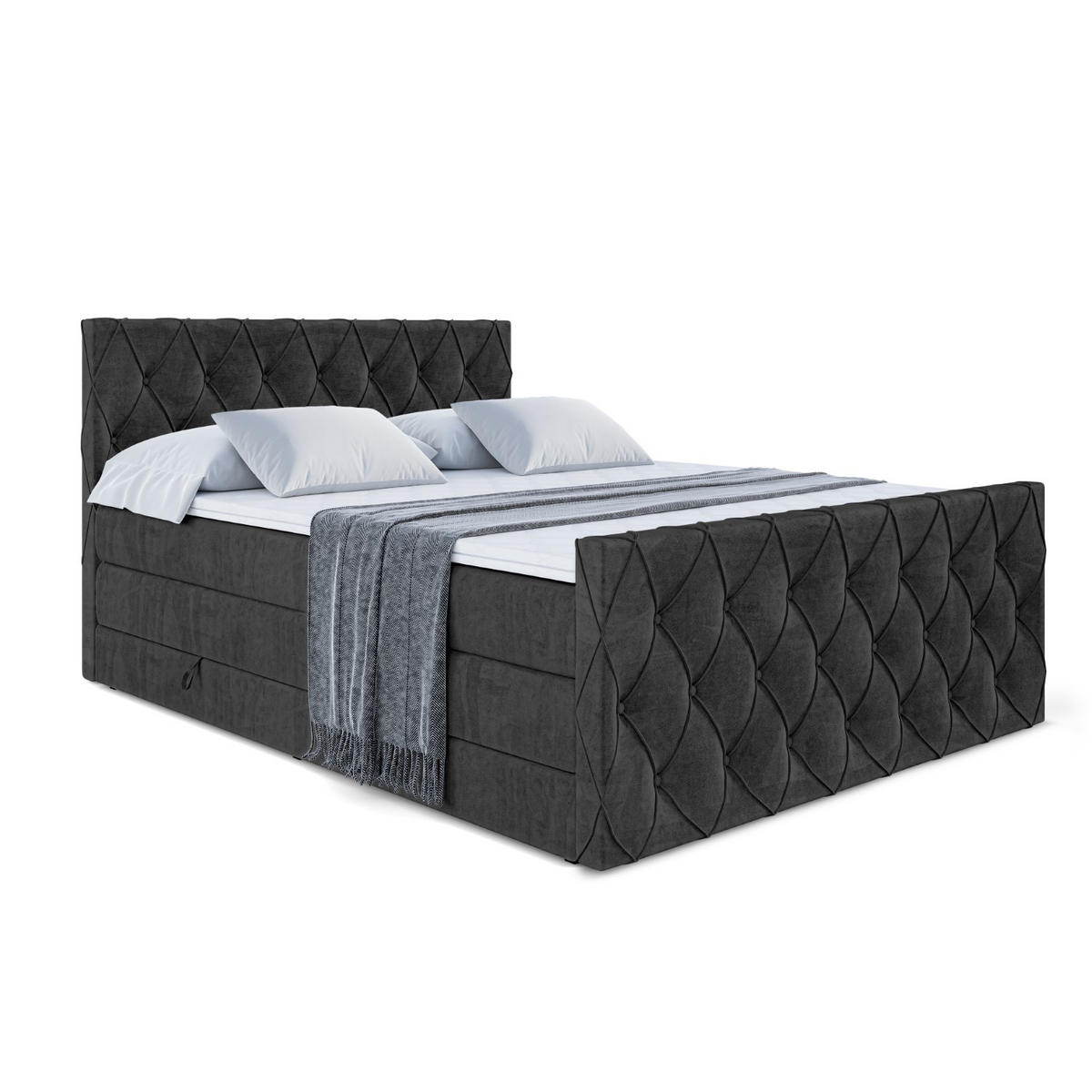 Das Boxspringbett ist ein Garant für einen langen, tiefen Schlaf und erholsame Nächte. Das Bett ist mit zwei Bettkästen ausgestattet, die viel Platz für Bettwäsche und Kissen bieten und für ein aufgeräumtes Schlafzimmer sorgen. Gratis-Topper inklusive! Zu jedem Boxspringbett erhalten Sie einen hochwertigen Topper aus Polyurethanschaum gratis dazu. Er sorgt für eine optimale Luftzirkulation während des Schlafs und passt sich perfekt der Körperform an – für noch mehr Komfort und ein angenehmes Liegegefühl.Die erste Matratze ist mit Bonellfederung (200 Federn/m2) und hochelastischem PUR- Schaumstoff T30, mit Härtegrad H3.
