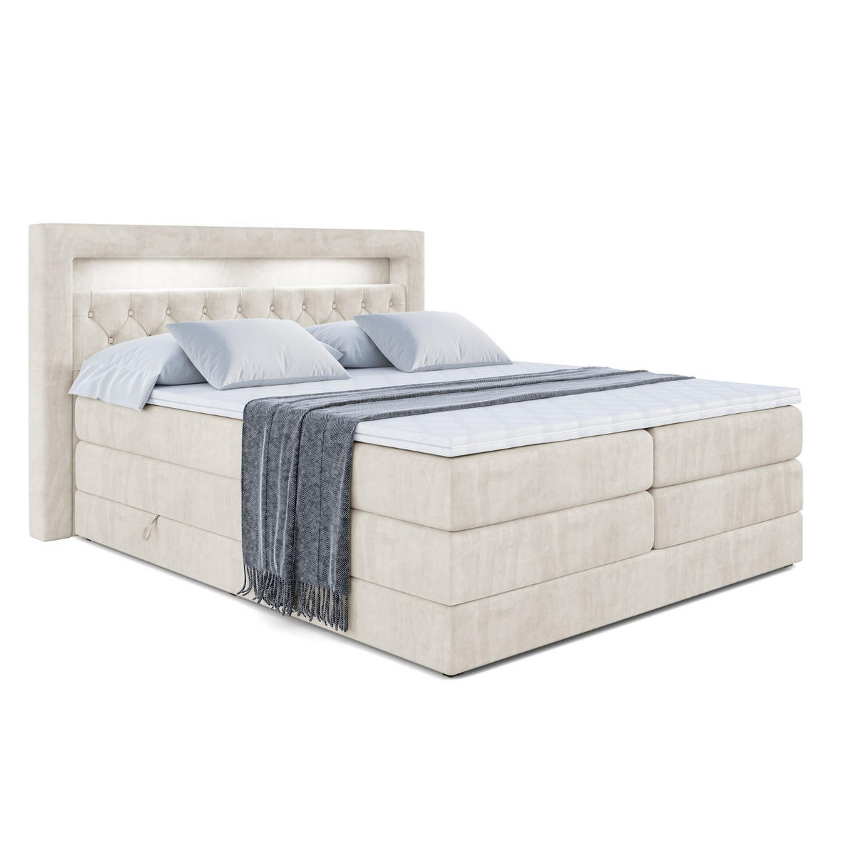 Das Boxspringbett ist ein Garant für einen langen, tiefen Schlaf und erholsame Nächte. Das Bett ist mit zwei Bettkästen ausgestattet, die viel Platz für Bettwäsche und Kissen bieten und für ein aufgeräumtes Schlafzimmer sorgen. Gratis-Topper inklusive! Zu jedem Boxspringbett erhalten Sie einen hochwertigen Topper aus Polyurethanschaum gratis dazu. Er sorgt für eine optimale Luftzirkulation während des Schlafs und passt sich perfekt der Körperform an – für noch mehr Komfort und ein angenehmes Liegegefühl.Die erste Matratze ist mit Bonellfederung (200 Federn/m2) und hochelastischem PUR- Schaumstoff T30, mit Härtegrad H3.