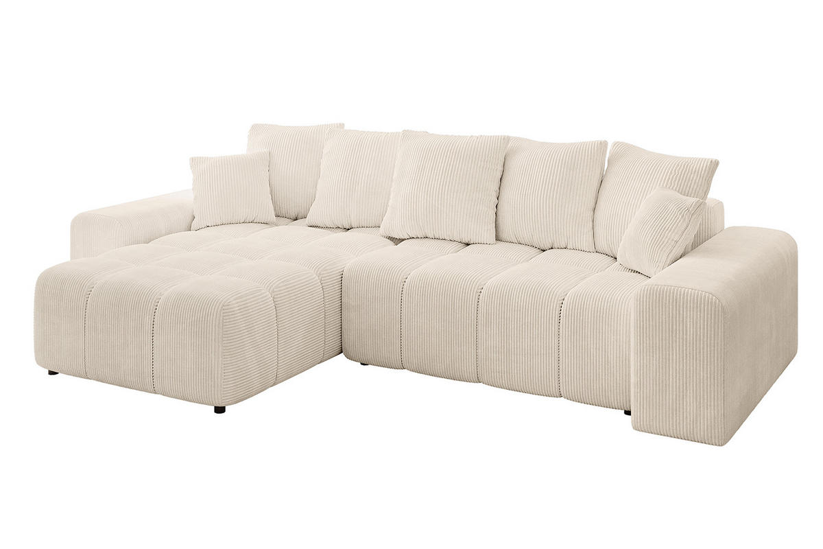 Das moderne Polstersofa mit Schlaffunktion ist ein universelles Möbelstück. Das links oder rechts angeordnete Schlafsofa in L-Form bietet einen hohen Sitz-, Liege- und Schlafkomfort in jeder Situation. Dank ihrer gemütlichen Optik mit Sofakissen ist die Couch dazu hervorragend geeignet, um mit Familie oder Freunden Zeit zu verbringen Die rückenechte Polstercouch überzeugt durch ihre elegante Optik und rundet das Gesamtbild gekonnt ab. Die robuste Auszugsmechanik ist sehr einfach zu bedienen und verwandelt die Wohnzimmercouch im Handumdrehen in ein bequemes Gästebett. Das stabile Untergestell aus Möbelplatte und Holz garantiert die notwendige Standfestigkeit des Möbelstücks. Für mehr Ordnung ist die gemütliche Couch mit einem praktischen Bettkasten zur Aufbewahrung von Bettwäsche oder Decken ausgestattet. Komfort, der bleibt – Hochwertiger SchaumstoffIm Sitzbereich wird hochwertiger Polyurethanschaum verwendet – ein Material mit erhöhter Festigkeit und hoher Widerstandsfähigkeit gegen Verformung. Eine ideale Lösung für alle, die Wert auf Langlebigkeit und festen Sitzkomfort legen. Bitte beachte:
