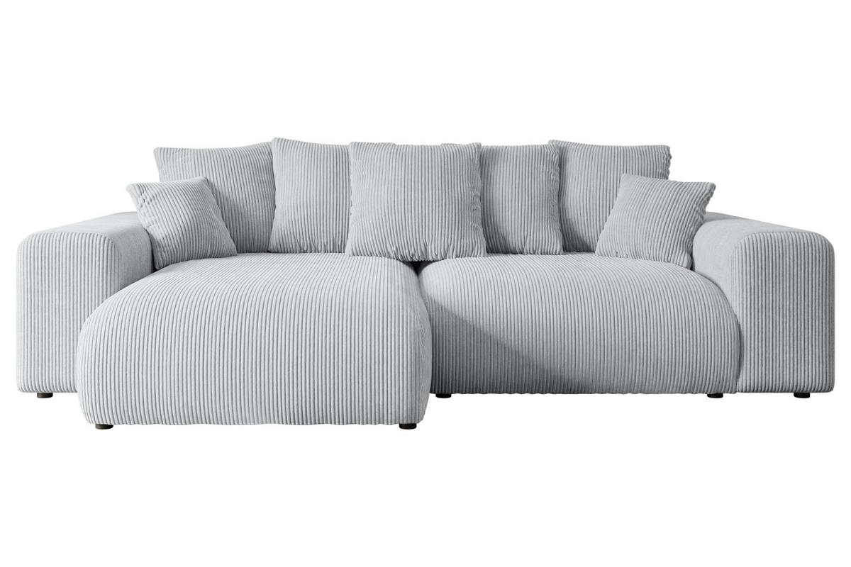 Das moderne Polstersofa mit Schlaffunktion ist ein universelles Möbelstück. Das links oder rechts angeordnete Schlafsofa in L-Form bietet einen hohen Sitz-, Liege- und Schlafkomfort in jeder Situation. Dank ihrer gemütlichen Optik mit Sofakissen ist die Couch dazu hervorragend geeignet, um mit Familie oder Freunden Zeit zu verbringen Die rückenechte Polstercouch überzeugt durch ihre elegante Optik und rundet das Gesamtbild gekonnt ab. Die robuste Auszugsmechanik ist sehr einfach zu bedienen und verwandelt die Wohnzimmercouch im Handumdrehen in ein bequemes Gästebett. Das stabile Untergestell aus Möbelplatte und Holz garantiert die notwendige Standfestigkeit des Möbelstücks. Für mehr Ordnung ist die gemütliche Couch mit einem praktischen Bettkasten zur Aufbewahrung von Bettwäsche oder Decken ausgestattet. Komfort, der bleibt – Hochwertiger SchaumstoffIm Sitzbereich wird hochwertiger Polyurethanschaum verwendet – ein Material mit erhöhter Festigkeit und hoher Widerstandsfähigkeit gegen Verformung. Eine ideale Lösung für alle, die Wert auf Langlebigkeit und festen Sitzkomfort legen. Bitte beachte:
