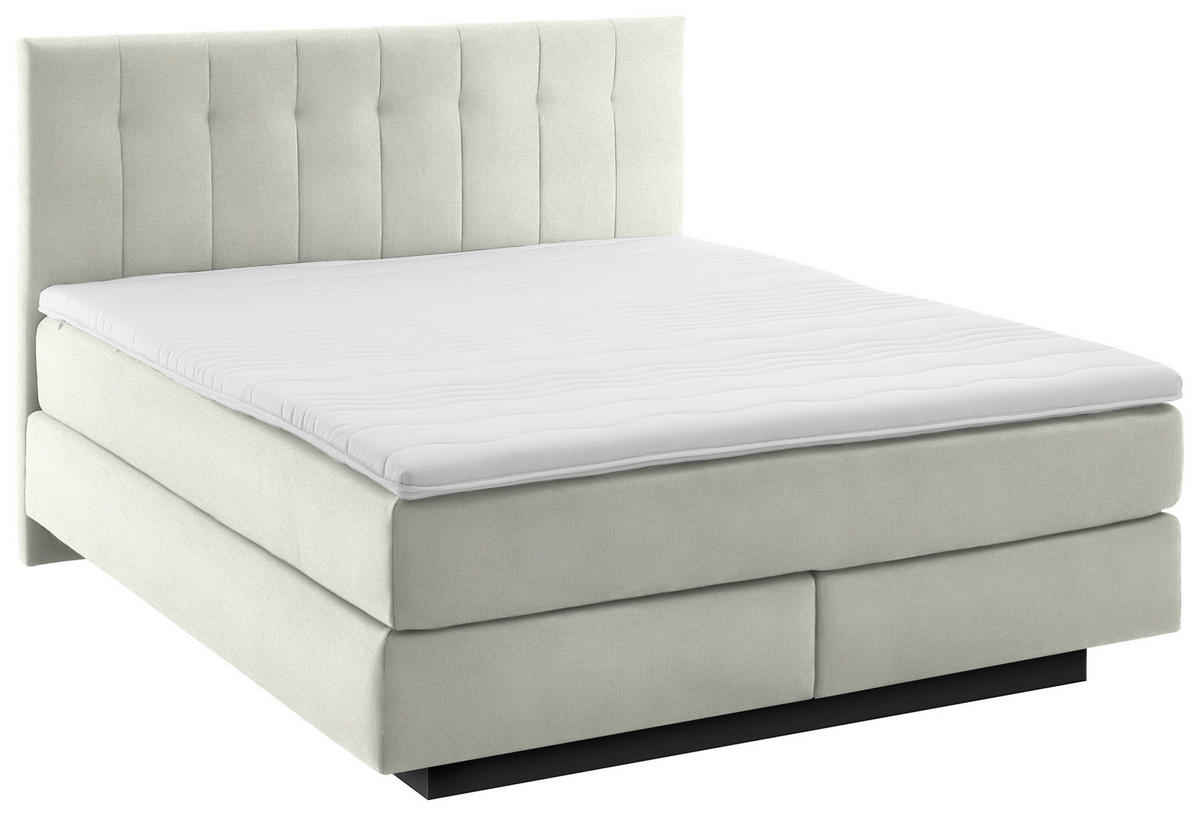 Schwarz setzen stylishe Akzente. Einschlafen, entspannen, genießen – mit diesem Boxspringbett (ca. 160 x 200 cm) in Naturfarben inklusive Matratze, Topper und gepolstertem Kopfteil, das zur Oase der Ruhe wird!