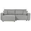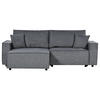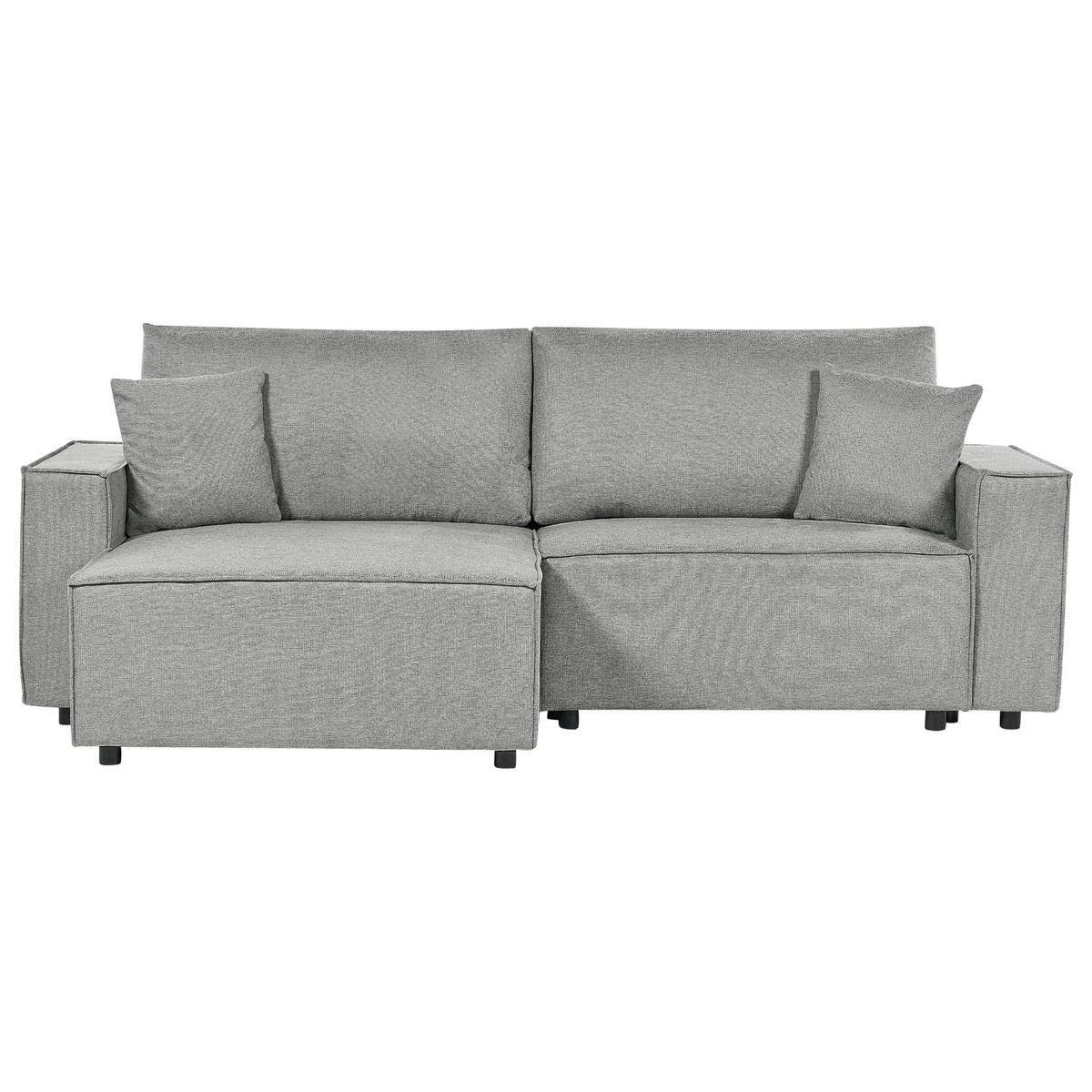 Modernes 3-Sitzer Schlafsofa mit praktischem Bettkasten, breiten Armlehnen und zwei Dekokissen. Genießen Sie den Komfort und die Vielseitigkeit, die dieses elegante L-förmige Sofa mit sich bringt. Das Ecksofa zeichnet sich durch seine robuste Holzkonstruktion aus, die mit einem hochwertigen, angenehm weichen Stoffbezug, einer dicken Polsterung und passenden Zierkissen kombiniert wird. Dabei verfügt es über eine lange Chaiselongue, die sich perfekt als Liegeplatz vor dem Fernseher macht. Zudem lässt sich das Polstersofa leicht in ein gemütliches Bett umwandeln, auf dem dann bis zu zwei Personen schlafen können. In dem zusätzlichen Stauraum können Sie Ihr Bettzeug verstecken und sicher aufbewahren. Die schwarzen Kunststoffbeine vervollständigen das Design und sorgen für angemessene Stabilität während des Sitzens.