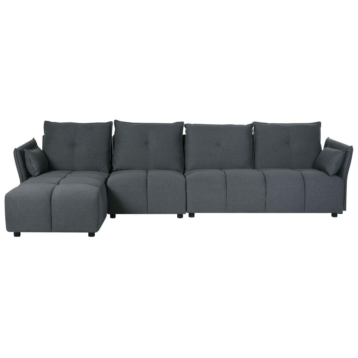 L-förmiges, graphitgraues 4-Sitzer Sofa mit vielen Kissen, breiter Chaiselongue und hohem Sitzkomfort. Wem Komfort besonders am Herzen liegt, für den ist dieses großzügige Wohnzimmersofa wie gemacht. Das Stoffsofa verzaubert mit seiner breiten Sitzfläche und -tiefe, die sich besonders beim Fernsehabend beweisen werden. Zudem verfügt es über eine lange Récamiere, auf der Sie Ihre Beine ausstrecken und neue Energie tanken können. Die mehreren Rückenkissen und die dicke Polsterung erhöhen den Sitzkomfort, während der graphitgraue Stoffbezug und das trendige Gesamtdesign des Möbelstücks Ihr Wohnzimmer aufwerten.