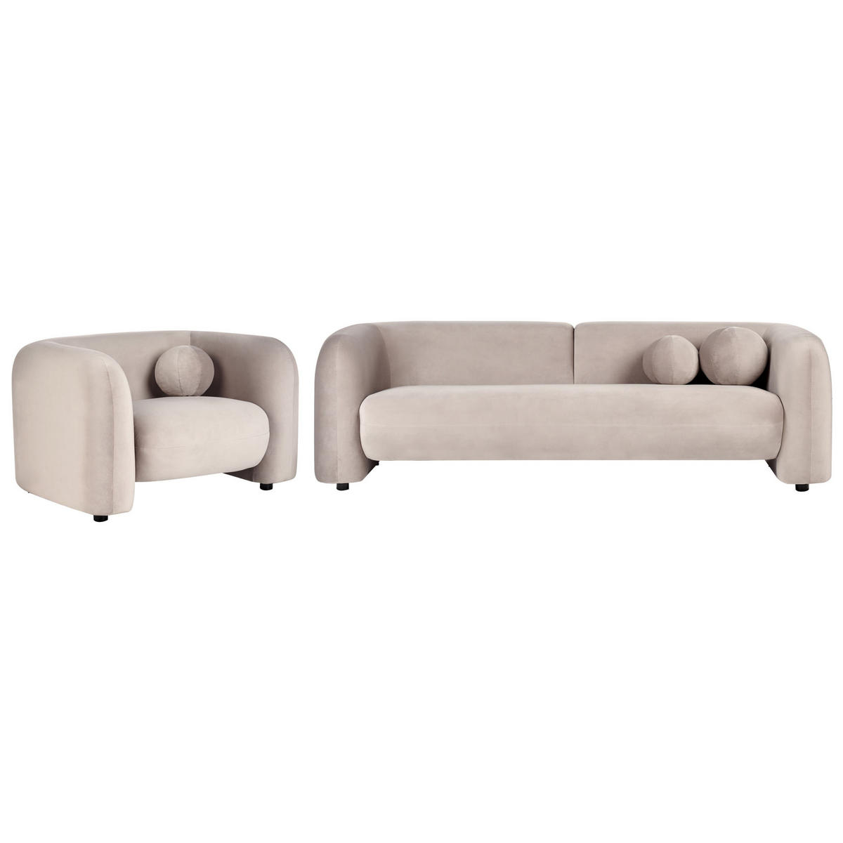Wohnzimmergarnitur aus Samt mit runden Dekokissen. Dieses elegante, glamouröse Sofa-Set wird definitiv zum Lieblingsstück Ihres Wohnzimmers. Das Set ist aus einem sanften Samtstoff gefertigt, der sich angenehm weich anfühlt und das Ambiente des Raumes aufwertet. Die Couch und der Sessel sind darüber hinaus auch strapazierfähig und müssen nicht häufig gepflegt werden. Die dicke Sitzfläche und die zusätzlichen Kissen mit abnehmbaren Bezügen garantieren einen hohen Komfort beim Fernsehen, für Gäste oder einfach nur beim Entspannen nach der Arbeit.