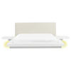 Exklusives Bett im japanischen Stil mit 2 Nachttischen, LED-Licht und Kunstleder-Kopfteil. Das natürliche, weiße Holzfurnier harmonisiert ausgezeichnet mit dem weißen Kunstlederbezug der beiden Kopfteile und den zwei, flachen Nachttischen an den Seiten. Wahlweise lassen sich beide Nachtkonsolen auch leicht abnehmen. Der stabile Lattenrost sorgt zusätzlich für eine perfekte Klimatisierung, während das robuste Holzuntergestell angemessene Stabilität verspricht. Dank der praktischen LED-Lichtleiste mit Bewegungssensor wird der Raum ab jetzt sanft beleuchtet, sobald Ihr Fuß den Boden berührt. Mit einem Zeitschalter lässt sich die Dauer der Beleuchtung einstellen. So ist der Raum auch noch sanft beleuchtet, wenn Sie nach ein paar Minuten wieder zurück kommen und ermöglicht Ihnen sicheres Navigieren.