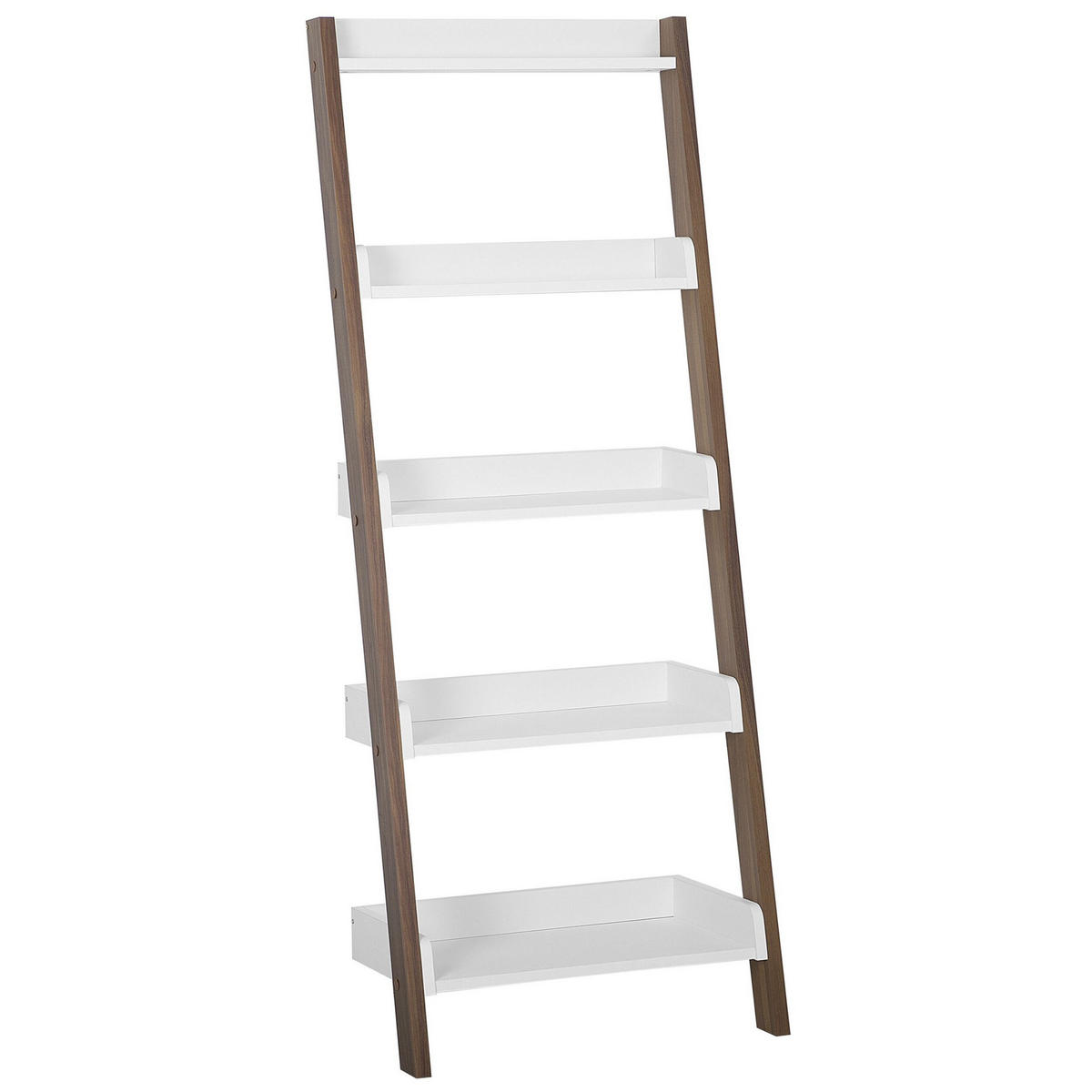 Geräumiges und dekoratives Leiterregal. Dieses praktische Leiterregal in einem trendy Design bietet für jeden Raum eine funktionelle Lösung. 5 geräumige Ablagen mit praktischen Rück- und Seitenrändern bieten jede Menge Stellfläche für Bücher, Fotos und vieles mehr. Die Größen der fünf Ablagen sind der schrägen Aufstellung zur Wand perfekt angepasst. Das Regal ist auch sehr pflegeleicht. Das trendy Leiterregal punktet mit Übersichtlichkeit und einen offenen Charakter.