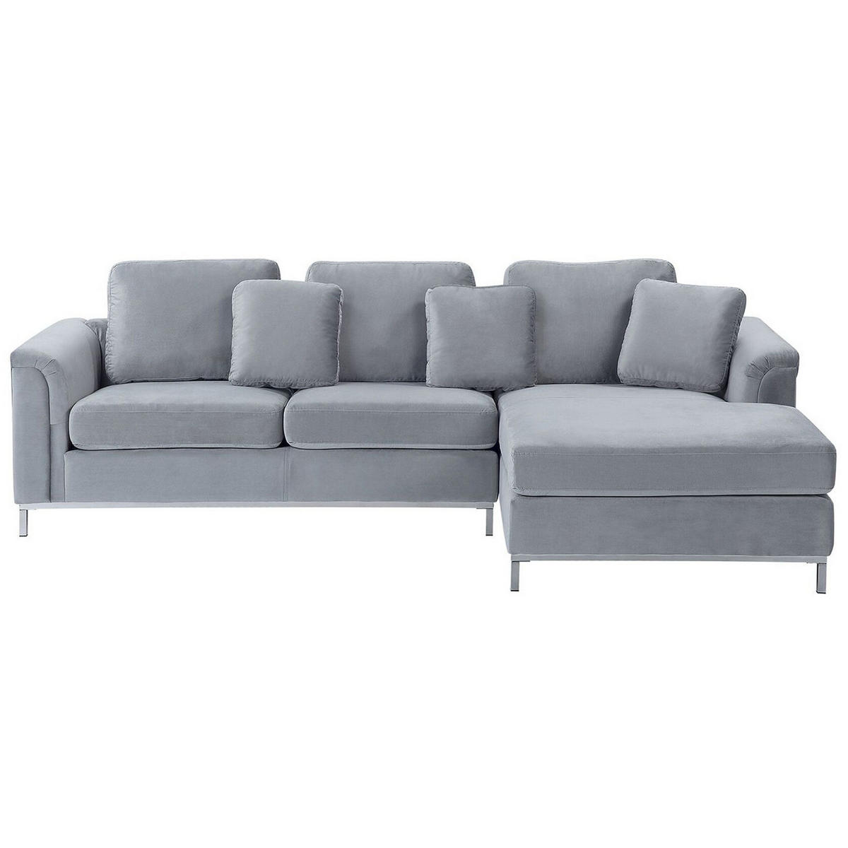 Elegantes Ecksofa in Grau. Das elegante Ecksofa mit integrierter Récamiere bietet viel Platz zum Relaxen. Der Bezug aus hochwertigem Samtstoff ist pflegeleicht und strapazierfähig. Die stabilen und verchromten Füße verleihen dem Sofa eine moderne Ausstrahlung. Das atemberaubende Ecksofa bietet immer ausreichend Platz - für Sie, Ihre Familie und Ihre Gäste.
