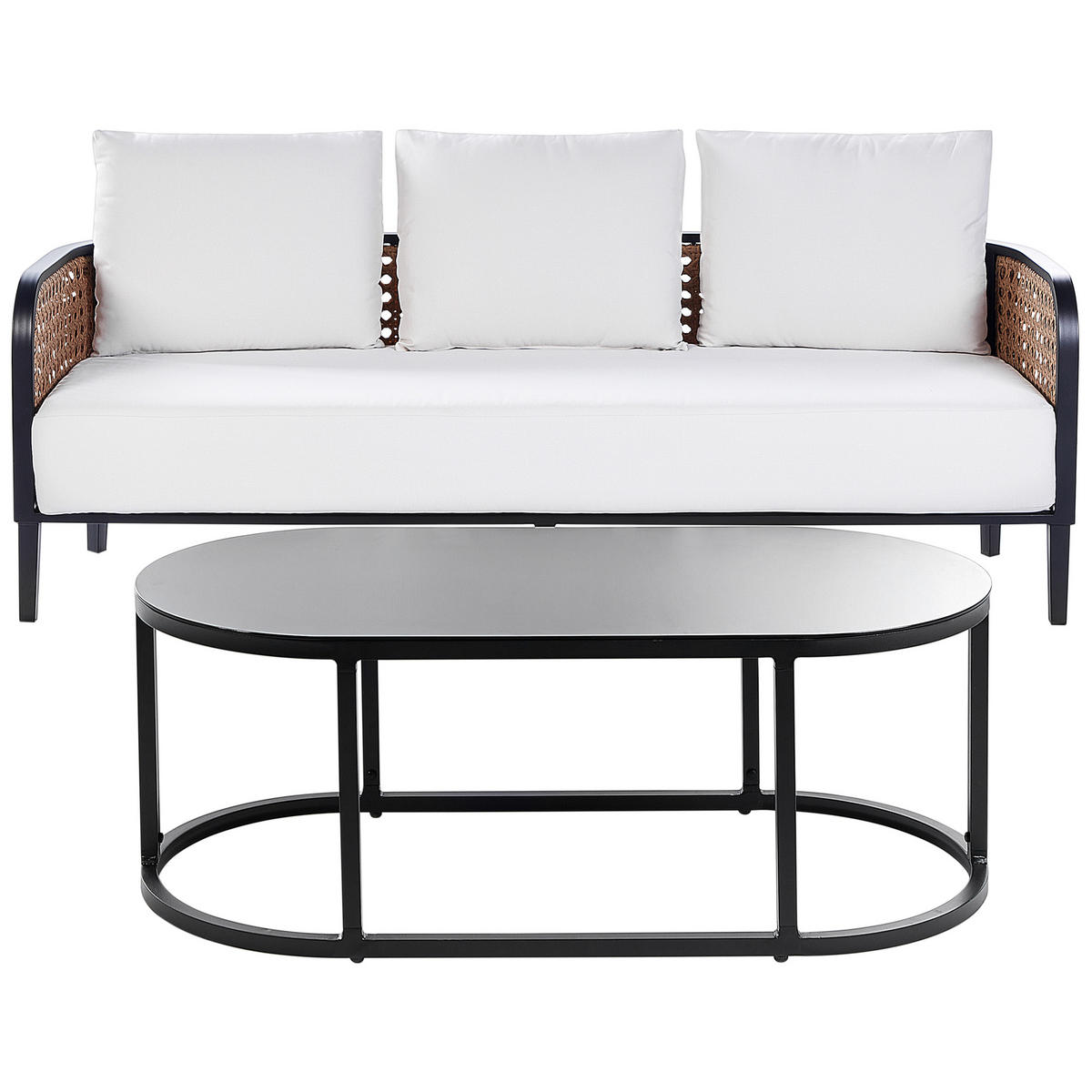 Modulares Gartensofa und Couchtisch-Set mit Wiener Geflecht. Werten Sie Ihren Garten mit diesem Lounge-Set auf stilvollste Weise auf. Das Gestell des Sitzes und des Tisches ist aus hochwertigem, langlebigem Aluminium in Schwarz gefertigt und ist daher rostfrei. Die Rückenlehne des Gartensofas ist mit einem Wiener Geflecht aus PE-Rattan verziert, das in jedem Außenbereich zum Eyecatcher wird. Zudem sind dick gepolsterte, cremefarbene Kissen aus wasserabweisendem Stoff mit im Set enthalten, die sich für den Gebrauch im Freien eignen. Dank des modernen Looks können Sie dieses Set mit verschiedenen Gartenstilen kombinieren.
