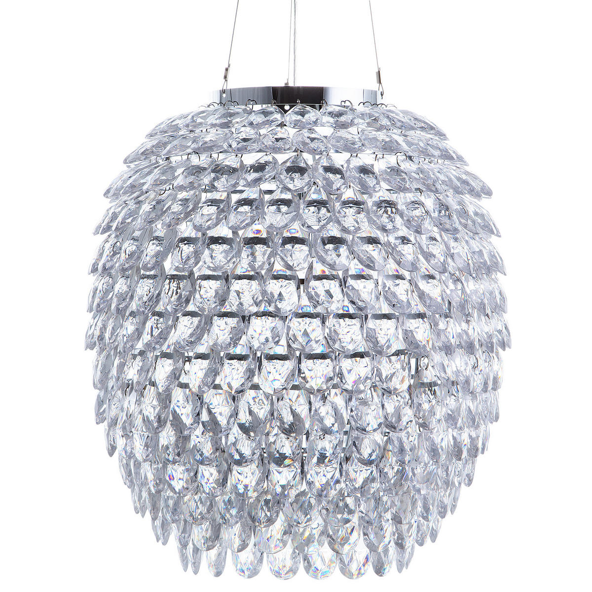 Glamour pur in glänzendem Chrom mit Kristall-Optik. Diese schicke und dekorative Hängelampe bringt Glamour in Ihre Wohnung. Das Gestell des ovalen Lampenschirms ist aus stabilem, verchromtem Metall gefertigt, verziert mit vielen, durchsichtigen Strasskristallen, die einen atemberaubenden Lichteffekt erzeugen. Die glitzernden Elemente reflektieren das Licht und schaffen somit ein elegantes Ambiente im Raum - fühlen Sie sich wie in einem Ballsaal.