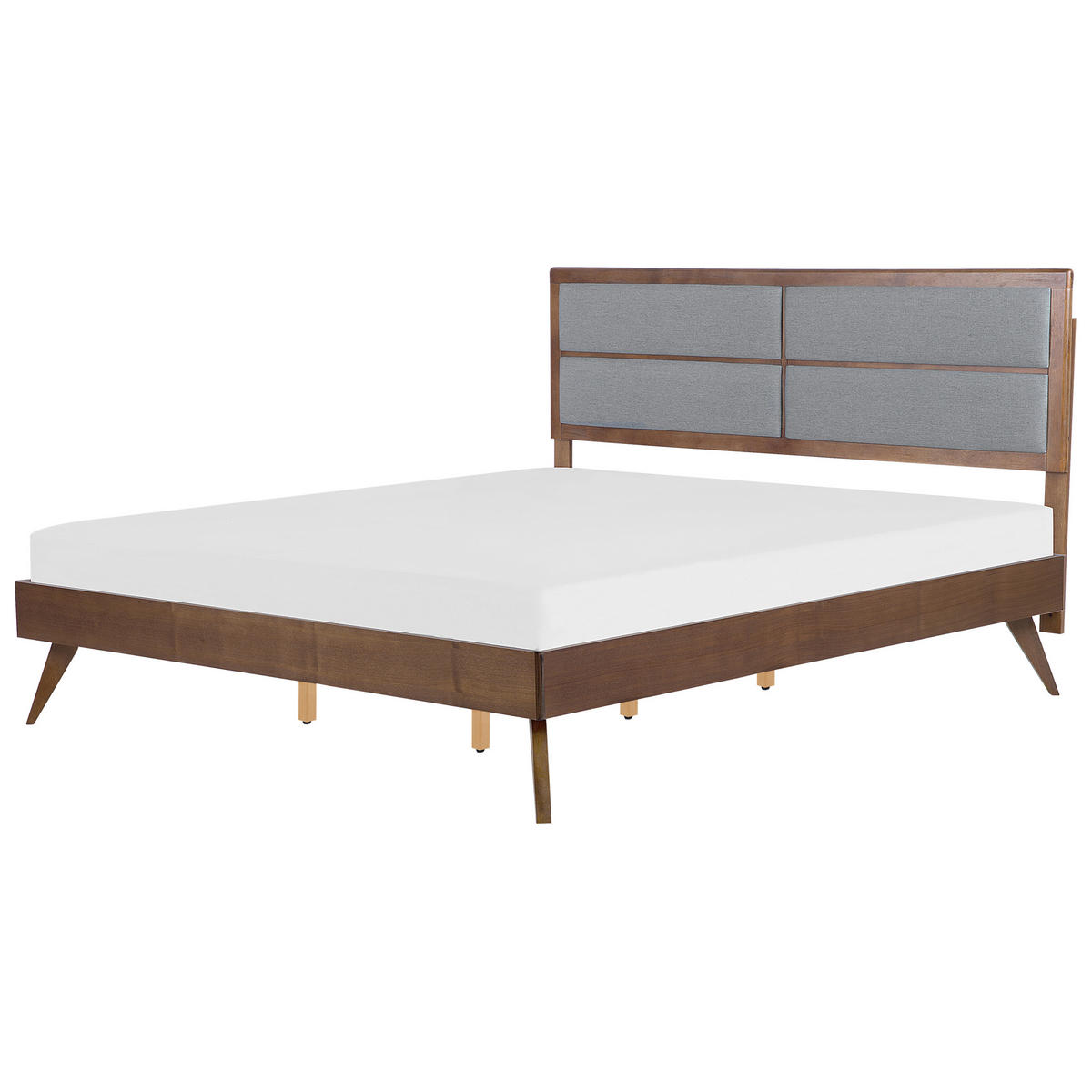 Bequemes Doppelbett mit dekorativem Kopfteil. Dieses schöne Doppelbett in zeitlosem Design ist für jeden Wohnstil geeignet. Es ist aus hochwertigem Gummibaumholz mit edlem Eschsnholz-Furnier gefertigt und steht auf vier stabilen Füßen. Das dekorative Kopfteil mit grauer Polsterung ist sehr bequem und lädt zum Lesen ein.