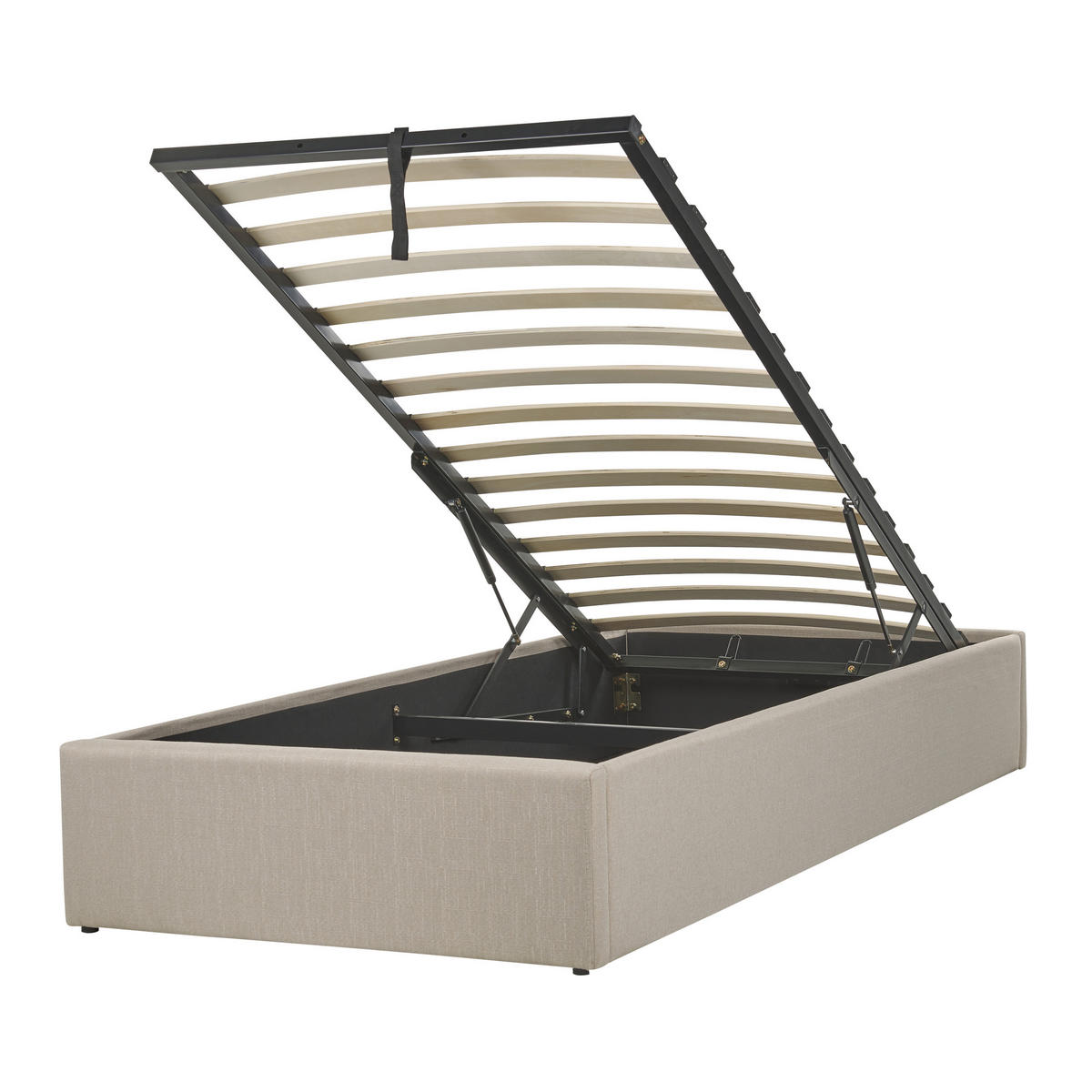 Modernes Einzelbett mit praktischem Stauraum. Dieser robuste Bettrahmen kombiniert optimalen Schlafkomfort mit Funktionalität, schlichtem Design und einem weichen Stoffbezug. Der integrierte Lattenrost des Polsterbettes kann dank Gasdruckfeder leicht angehoben werden, sodass Sie Ihre Schlafutensilien sowie auch andere Gegenstände praktisch in dem darunter versteckten Bettkasten verstauen können. Da das Bett über kein Kopf- oder Fußteil verfügt, wirkt das Modell nicht nur offener, sondern es ist auch von jeder Seite aus gut erreichbar. Dank der kompakten Form eignet sich das Stoffbett auch für kleine Schlafzimmer und kann unter Dachschrägen, Fensterfronten oder frei im Raum platziert werden. Zudem können Sie es bei Bedarf mit einem separaten Polsterkopfteil ergänzen und so selbst über den Look des Einzelbettes entscheiden.