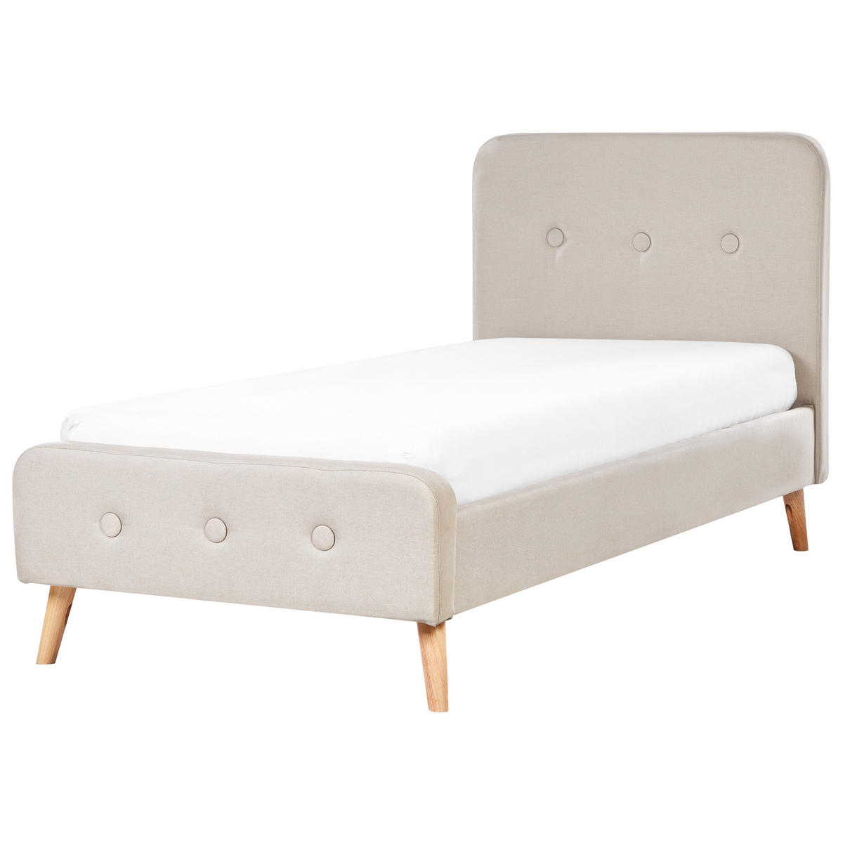 Exklusives Bett mit beigefarbenem Bezugsstoff in Leinenoptik. Das Bett ermöglicht Ihnen eine erholsame Bettruhe und wird Sie in einen angenehm tiefen Schlaf fallen lassen. Die sanfte beige Farbe des Polsterbettes in Leinenoptik ist im Einklang mit den hellen Holzfüßen, welche für Stabilität sorgen. Der elegante beige Bezugsstoff und die Form des Bettes werden Ihre Einrichtung stilsicher ergänzen. Die elegante Knopfverzierung von jeweils drei Knöpfen auf dem Kopfteil sowie am Fußende verleihen diesem Bett eine klassische Ausstrahlung.