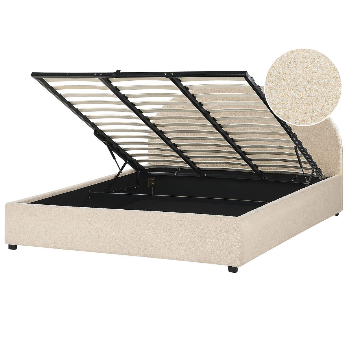 Minimalistisches Bett mit Polsterung. Wenn Sie in Ihrem Schlafzimmer einen Retro-Stil anstreben, sollten Sie Strukturstoffe und klassische Farben wählen. Kein anderes Bett passt besser zu diesem Einrichtungsstil als dieses Bouclé-Bett in Beige. Die Polsterung fühlt sich nicht nur angenehm an, sondern ist auch pflegeleicht und langlebig - dank ihr wird das Möbelstück viele Jahre lang halten. Das Produkt verfügt über einen Stauraum, der es Ihnen ermöglicht, Ihre zusätzlichen Kissen und Ihr Bettzeug in der Nähe Ihres Polsterbettes aufzubewahren.
