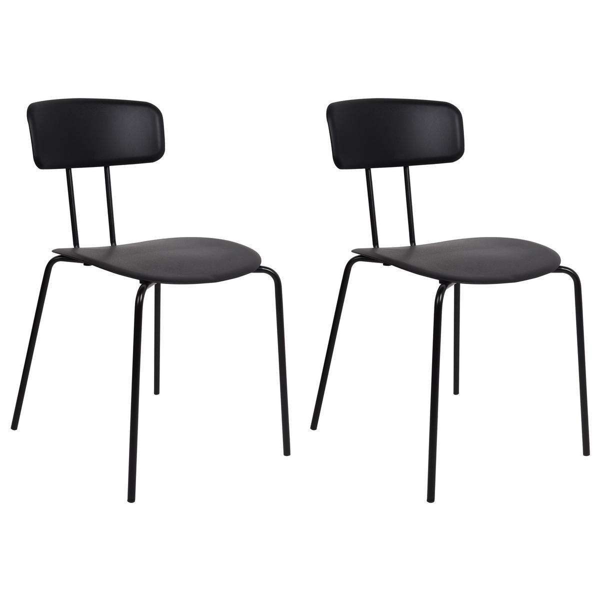 Zwei moderne, schwarze Stühle mit Metall-Gestell. Verleihen Sie Ihrem Esszimmer einen modernen Look mit diesen stilvollen Stühlen. Bei dem Design wurde bewusst auf Armlehnen verzichtet, damit Sie mehr Bewegungsfreiheit in Ihrer Küche oder Ihrem Esszimmer erhalten. Die Rückenlehnen und Sitzflächen sind aus robustem und pflegeleichtem Kunststoff gefertigt, während ihr schwarzes Gestell aus Eisen besteht, das für Stabilität sorgt. Die zusätzlichen Kunststoff-Schutzkappen schützen Ihren Boden vor Kratzern.