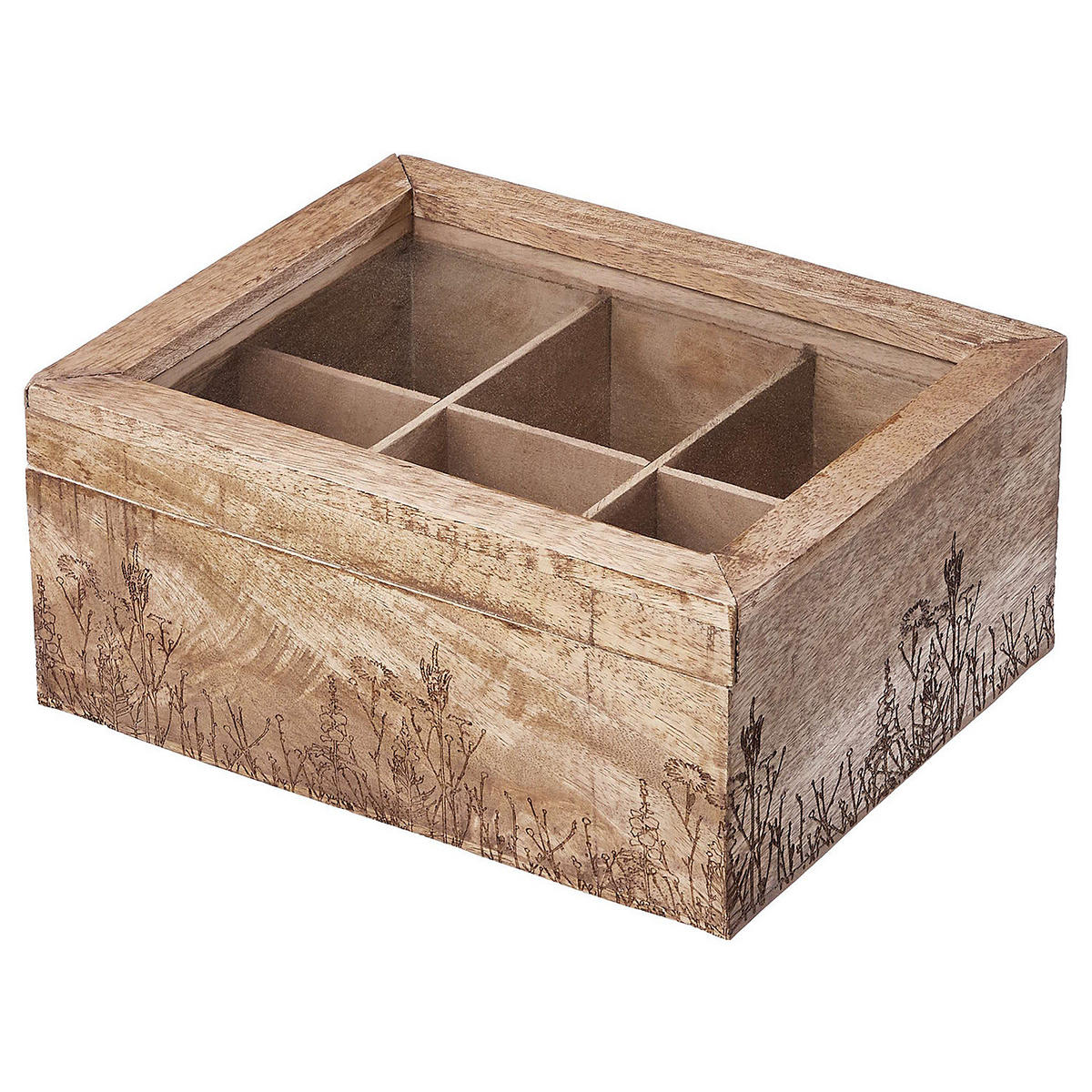 Alle Ihre Teesorten griffbereit: In der Tea Time Teebox mit Blumen-Lasergravur aus braunem Mangoholz verstauen Sie jede Menge Teebeutel übersichtlich und kompakt. Die dekorative Box braucht sich dabei nicht im Schrank zu verstecken und kann beispielsweise auf dem Frühstückstisch oder der Anrichte stehen bleiben - von Teatime zu Teatime.