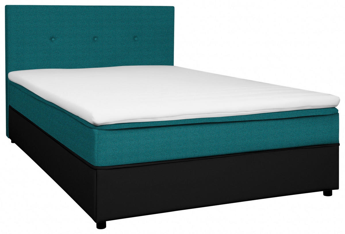 Knopfsteppung verleiht dem Gesamtbild eine heimelige Ausstrahlung. Verwandeln Sie Ihr Schlafzimmer in eine Oase der Ruhe mit diesem Boxbett (ca. 140 x 200 cm) in Schwarz sowie Türkis inklusive Matratze, Topper und gepolstertem Kopfteil!
