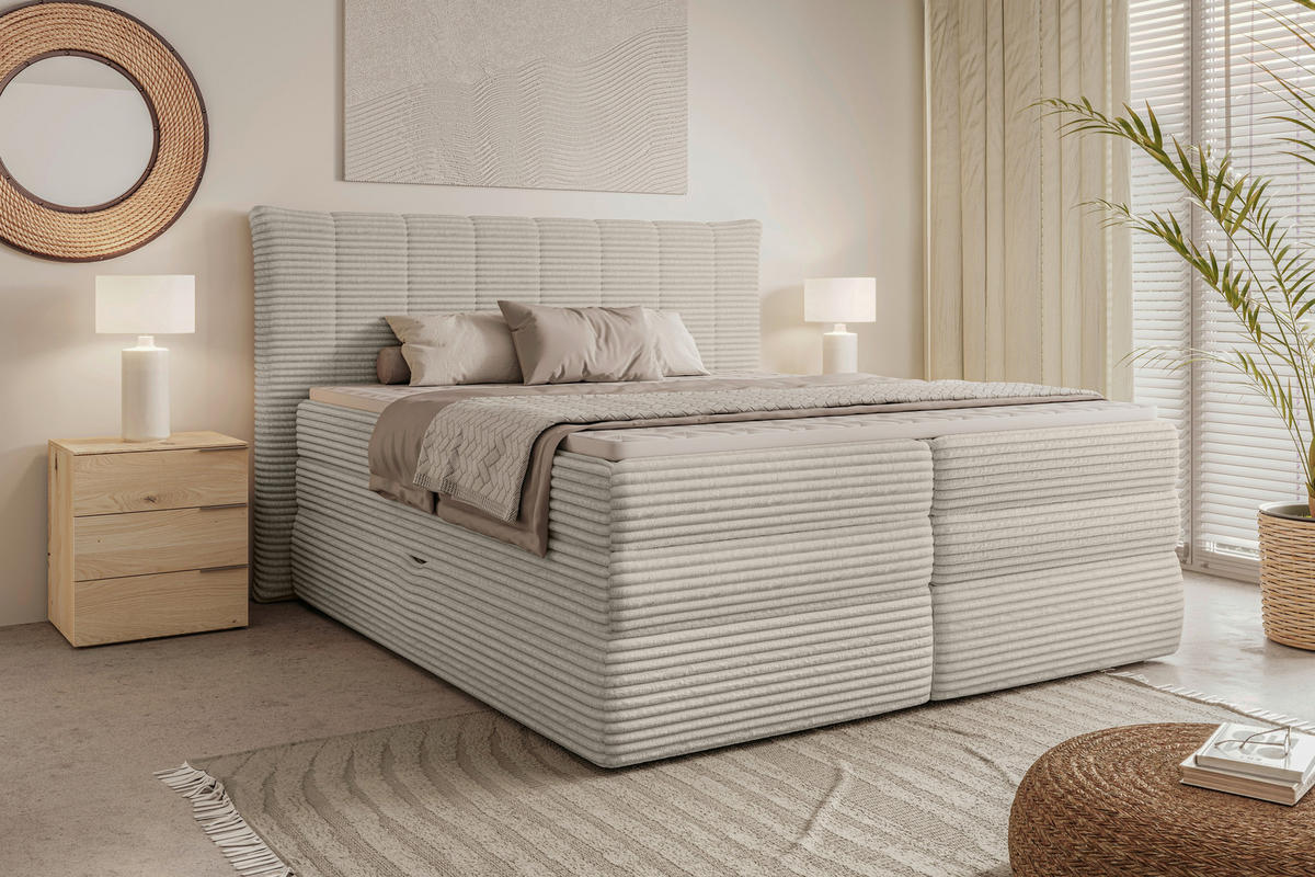 Beige inklusive Bettkasten begeistert als Ruhepol für eine stets entspannte Nacht.