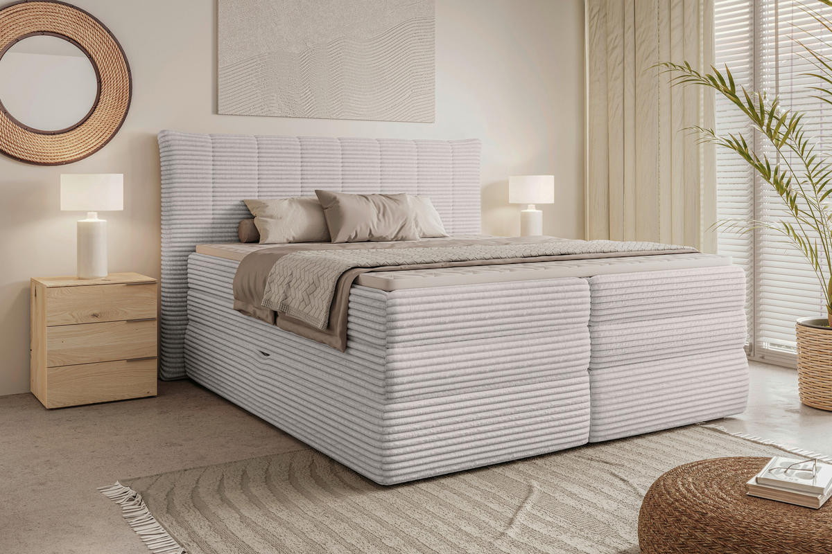 Durch die Fertigung mit einem Cord-Plüsch-Bezug (100 % Polyester) lässt das Bett Ihr Schlafzimmer mit seiner charmanten Farbgebung in Naturfarben modern und einladend wirken. Der