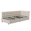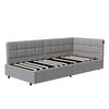 Praktische L-Form mit gepolsterter Rückenlehne ermöglicht eine platzsparende Nutzung als Bett oder Sofa. Besonders geeignet für kleine Räume, Jugendzimmer oder Gästezimmer