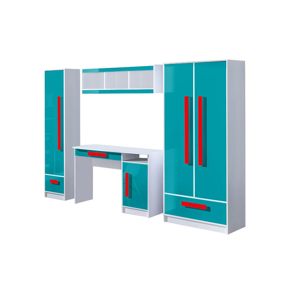 Feldmann-Wohnen JUGENDZIMMER-SET Guliver Weiß Matt / Türkis Hochglanz / Griffe Rot 4-teilig