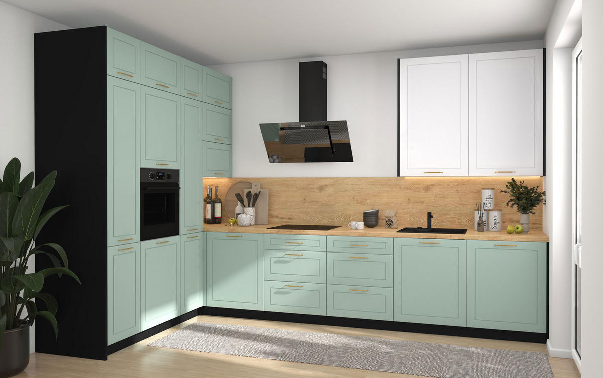 Feldmann-Wohnen L-FORM KÜCHENZEILE Bari (16-tlg) Schwarz / Blassgrün - Signalweiß