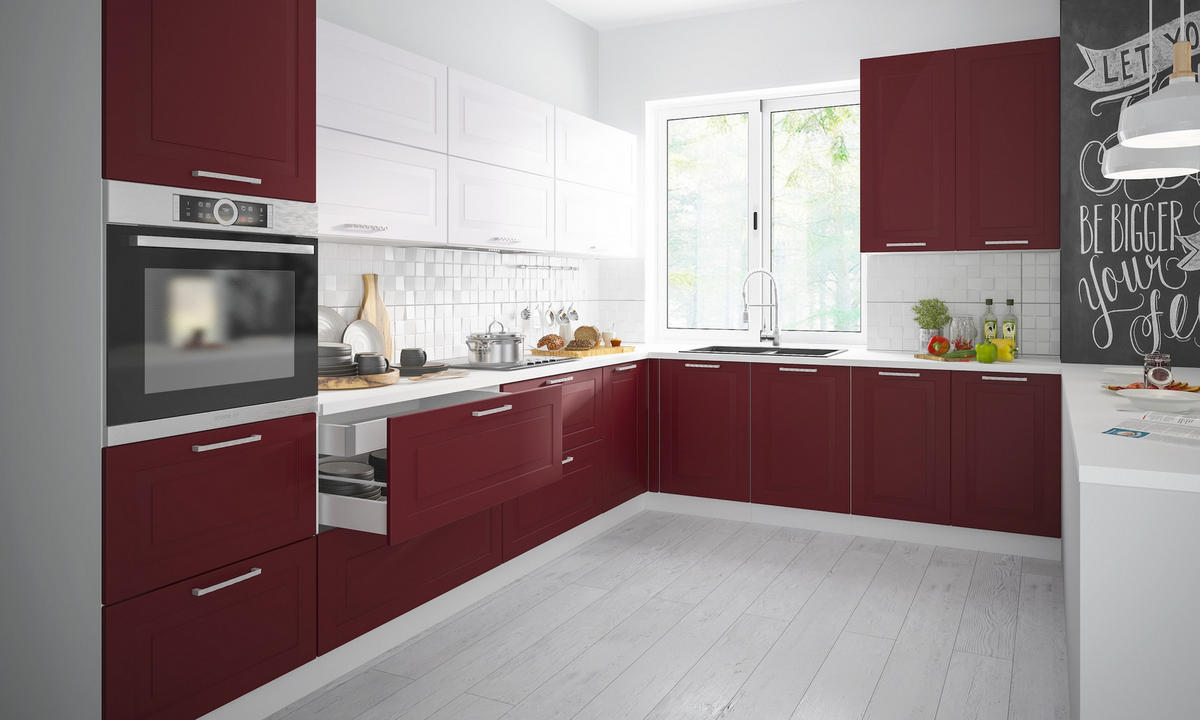 Feldmann-Wohnen WINKELKÜCHE Rimini grau / signalweiß - purpurrot matt 10-teilig