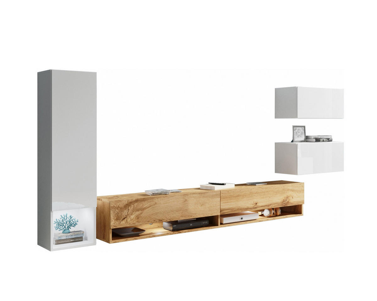 Feldmann-Wohnen WOHNWAND Amy weiß / weiß Hochglanz / Eiche Wotan 4-teilig