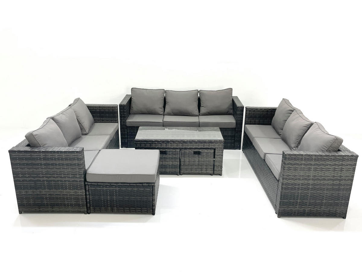 GARTENMÖBEL COUCHTISCH SET mit Sofa Polyrattan Outdoor 12-Sitzer - Dunkelgrau/Grau, Glas/Kunststoff - FimousFimous