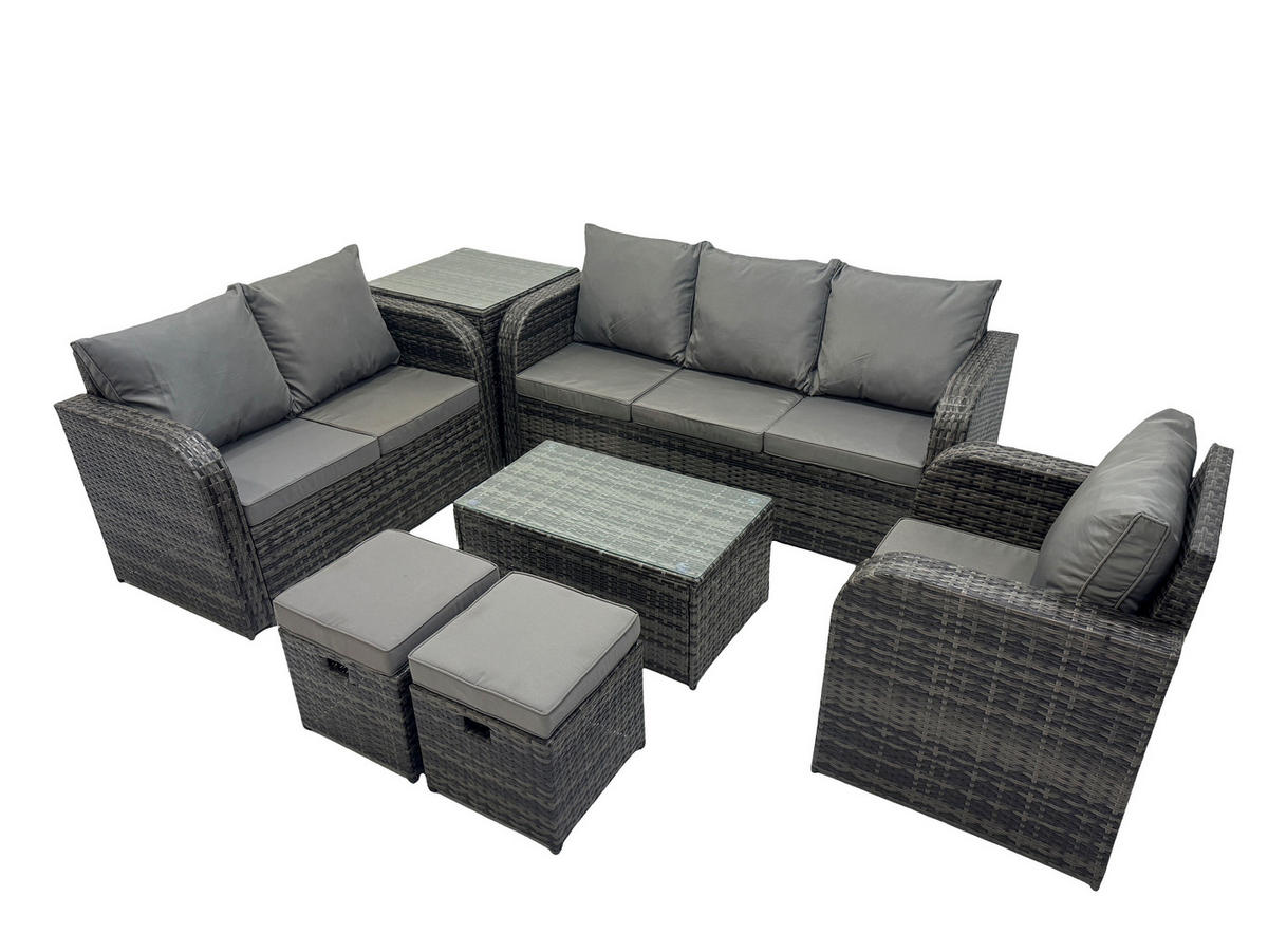 • Materialien:Polyrattan,Stoff,verzinkter Stahl,Schaum,Glas