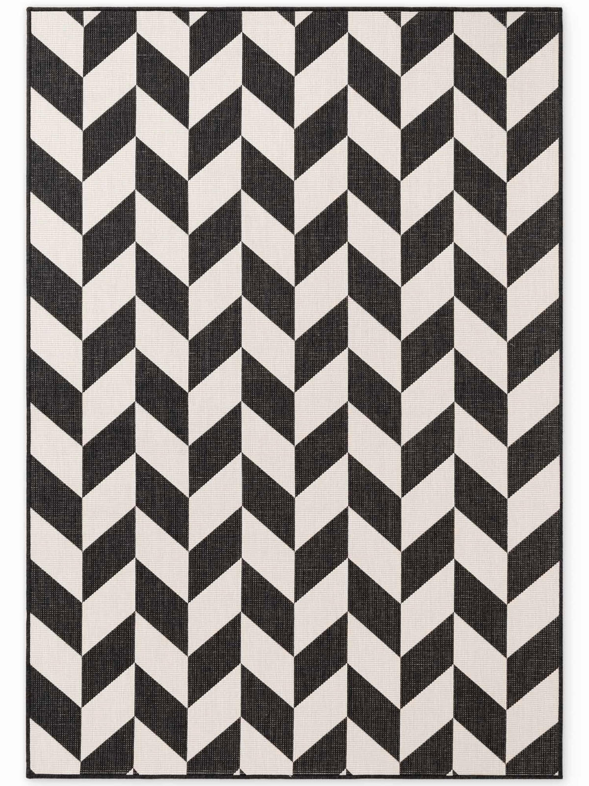 Dieser gewebte Flachwebeteppich im Format von ca. 160 x 230 cm (B x L) in Schwarz und Weiß zieht rechteckig alle Blicke auf sich.