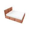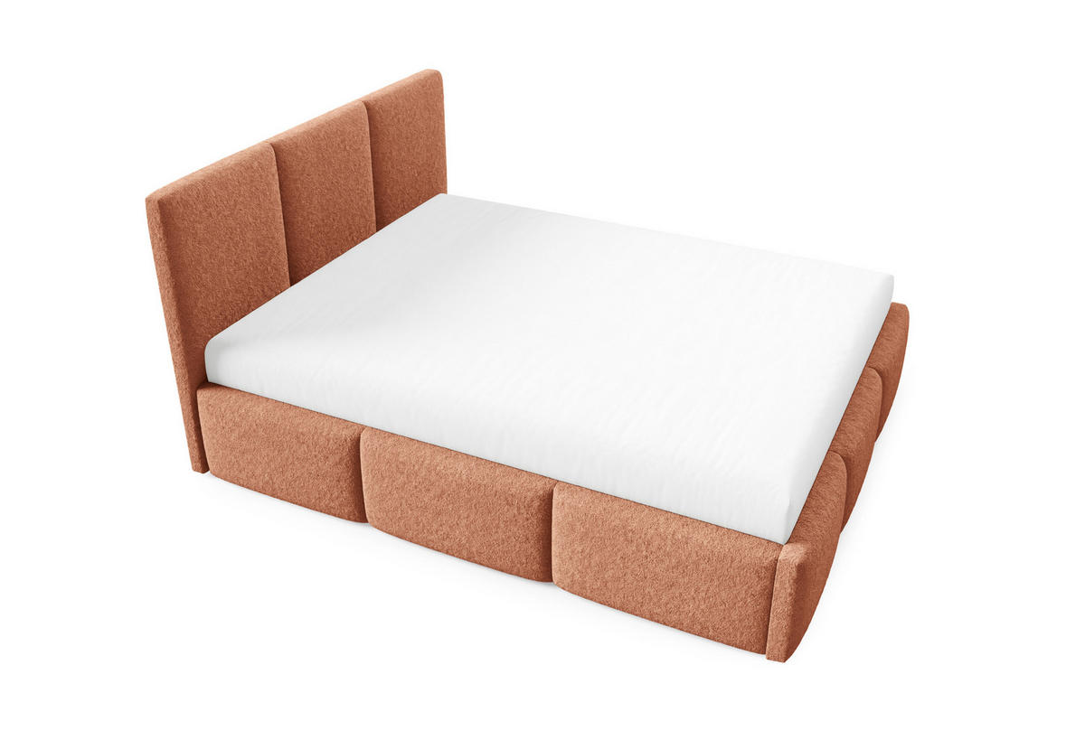 Dank der harmonischen Farbpalette – Creme, Beige, Hellgrau, Orange und Braun – lässt sich das Bett flexibel in verschiedene Einrichtungsstile integrieren. Das gepolsterte Design verleiht dem Schlafzimmer eine warme und gemütliche Ausstrahlung.