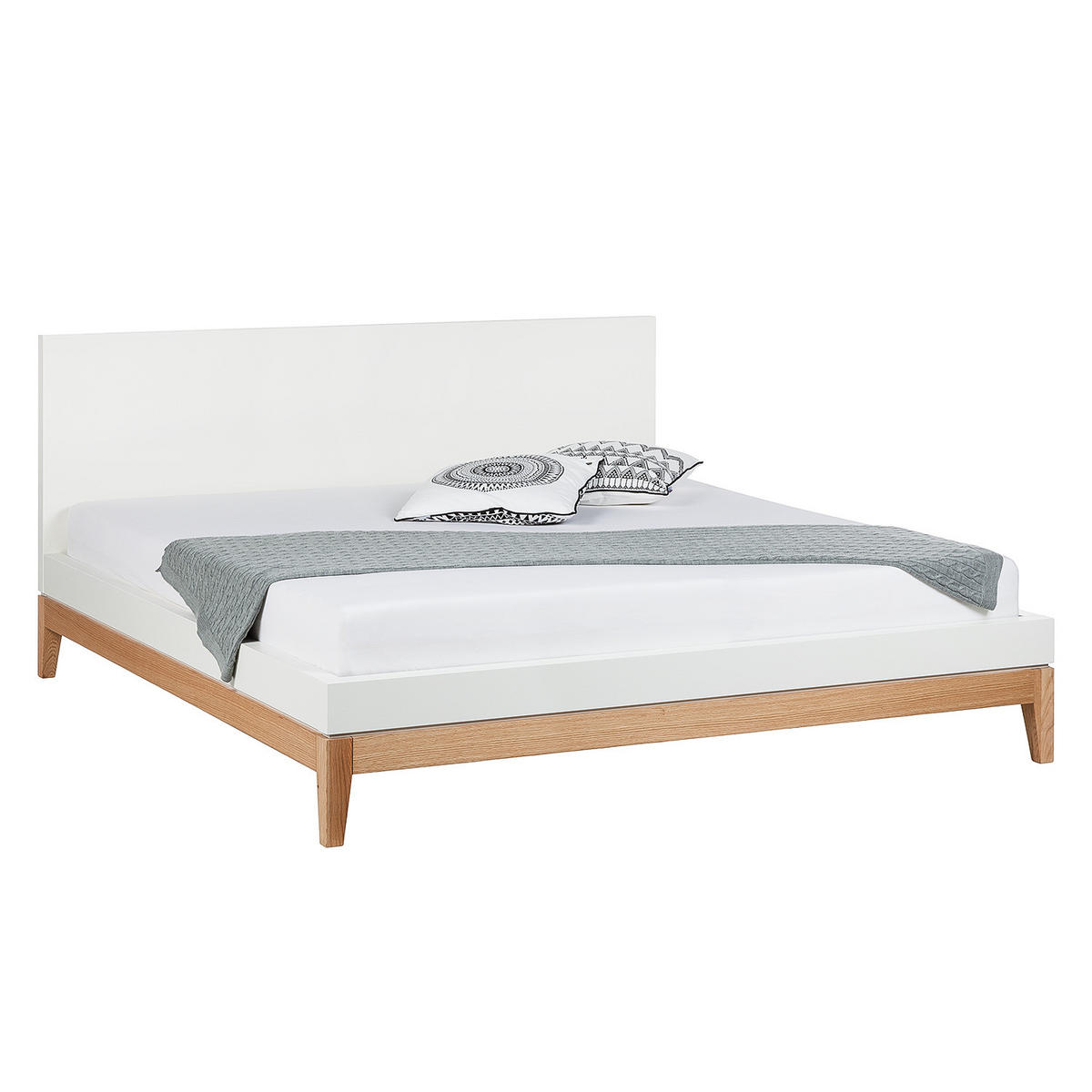 Dieses stabile Bettgestell sorgt mit seinem weißen, folierten Gestell und den Füßen aus lackierter Eiche für ein harmonisches und zeitloses Schlafzimmerambiente. Das hohe Kopfteil bietet einen komfortablen Support, während die hochwertige Materialkombination eine langlebige Standfestigkeit im modernen Schlafbereich garantiert. Dank der sorgfältigen Verarbeitung bildet der Schlafrahmen eine erstklassige Schlafstätte für Ihr Zuhause. Ein funktionales Basismöbel, das moderne Ästhetik und natürliche Akzente formvollendet miteinander verbindet.