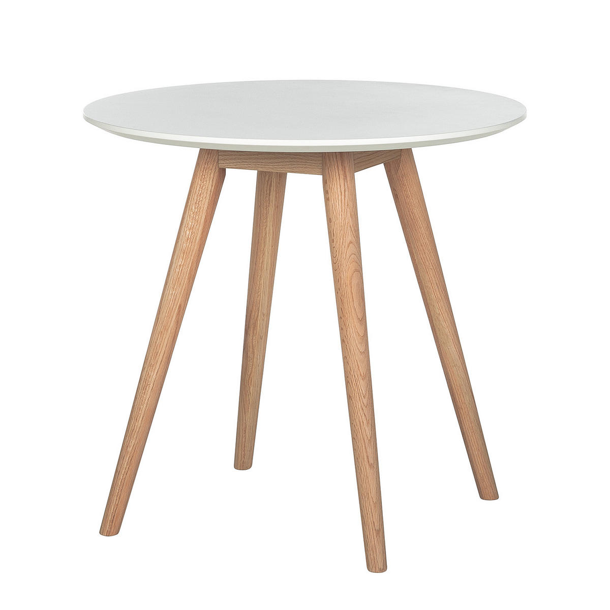 Dieser runde Esstisch sorgt durch seine Form für eine besonders kommunikative und einladende Atmosphäre in Ihrer modernen Küche oder kleinen Esszimmern. Die robuste MDF-Tischplatte auf Beinen aus massiver Eiche garantiert eine hohe Beständigkeit und maximale Standfestigkeit im täglichen Gebrauch. Dank der lackierten und beschichteten Oberflächen bleibt das Möbelstück dauerhaft schön und pflegeleicht geschützt. Ein kompaktes und stilvolles Designmöbel, das Platzbedarf und natürliche Wertigkeit stilsicher miteinander verbindet.