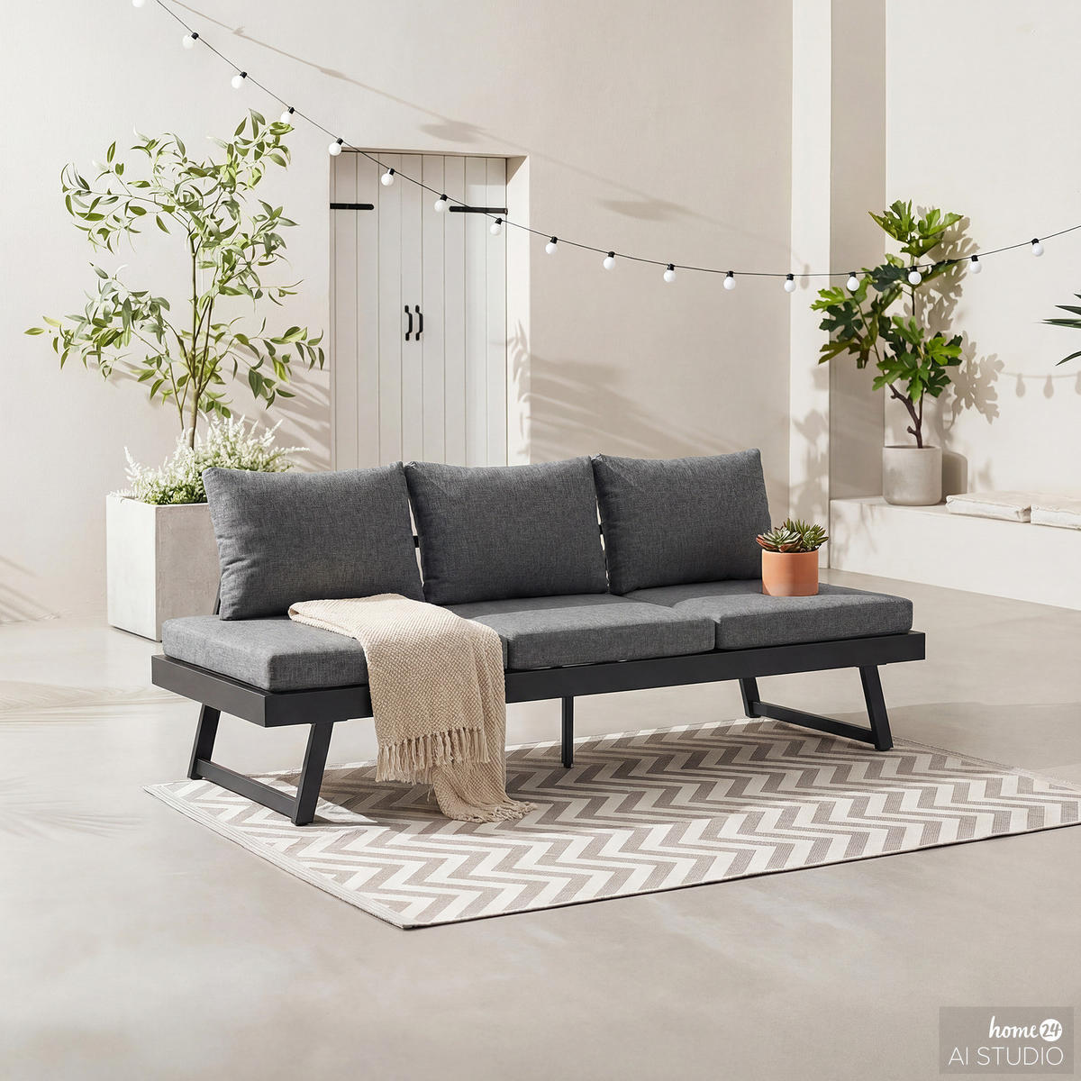 Das Loungesofa aus Aluminium und anthrazitfarbenem Polyester ist leicht, rostfrei und bietet eine moderne Ästhetik. Die großzügigen Polster laden zu entspannten Momenten auf der Terrasse ein.