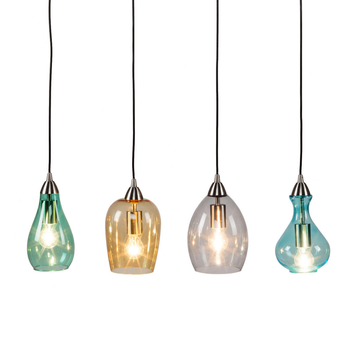 Diese 4-flammige Pendelleuchte im modernen Stil kombiniert klares Glas mit robustem Eisen. Sie spendet helles, gezieltes Licht über dem Esstisch und überzeugt durch ihr geometrisches, zeitgemäßes Design.