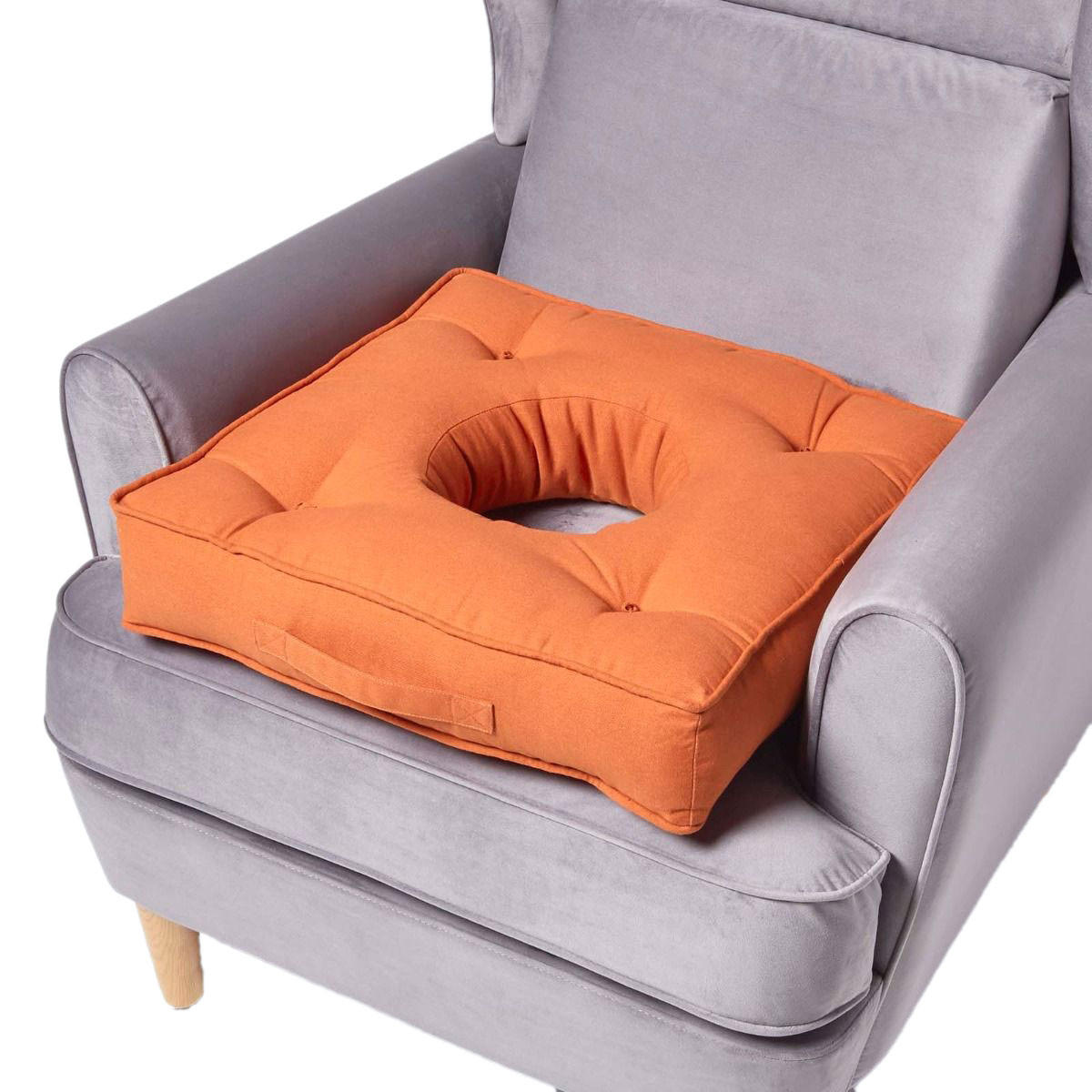 Bequemes und stützendes Sesselkissen mit mittiger Aussparung zur wirkungsvollen Druckentlastung bei Sitzbeschwerden. Das Kissen in Terracotta hat einen strapazierfähigen Baumwollbezug. Es ist 50 x 50 cm groß und komfortable 10 cm dick.