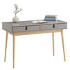 Der Bürotisch WANDA vereint zeitloses Design mit praktischer Funktionalität und wird so zu einem unverzichtbaren Möbelstück für Ihr Home Office oder Arbeitszimmer. Gefertigt aus massivem Kiefernholz, überzeugt er durch seine natürliche Stabilität und Langlebigkeit. Die Kombination aus einer grau lackierten Tischfläche und einem naturfarbenen Gestell verleiht dem Arbeitstisch eine elegante Optik, die sich harmonisch in jede Raumgestaltung einfügt. Zwei geräumige Schubladen mit stilvollen Lederlaschen sorgen für zusätzlichen Stauraum und schaffen Ordnung für Ihre Arbeitsmaterialien. Die konischen Beine sorgen nicht nur für Stabilität, sondern unterstreichen auch das moderne Design. Ob als Arbeitsplatz, PC-Tisch oder Bürotisch – WANDA passt sich flexibel Ihren Bedürfnissen an und bereichert Ihren Alltag mit durchdachter Funktionalität und ansprechender Ästhetik.