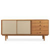 Sideboard SIMONADas Sideboard Simona vereint modernes Mid-Century-Design mit natürlichen Materialien. Die Kombination aus massivem Kiefernholz in Kastenien-Optik und stilvollem Rattan-Geflecht macht es zum Blickfang in jedem Raum. Vier geräumige Schubladen und zwei Schiebetüren bieten praktischen Stauraum. Ob im Wohnzimmer, Flur oder Esszimmer – unsere Anrichte mit Rattan ist ideal für moderne und natürliche Einrichtungsstile.Materialbeschreibung: