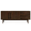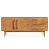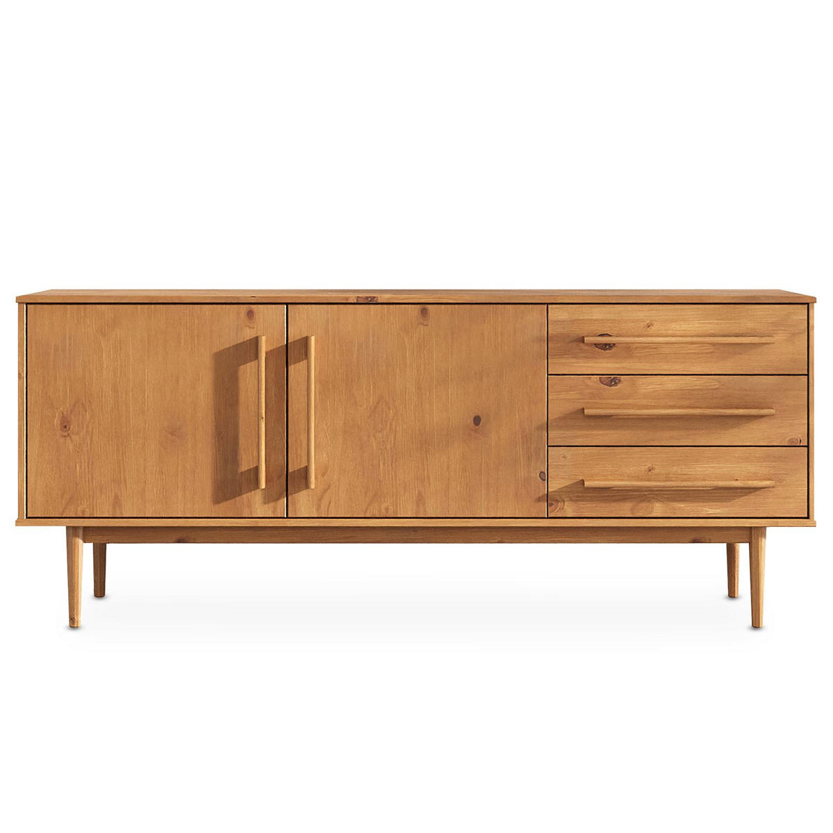 Sideboard TECCADiese stilvolle Kommode überzeugt durch ihr funktionales Design im Mid-Century Stil und ist ein echtes Highlight für Wohn- oder Eingangsbereiche. Das Möbelstück bietet großzügigen Stauraum hinter zwei Türen und in drei Schubladen. Ein verstellbarer Einlegeboden ermöglicht eine flexible Nutzung des Innenraums. Dank des massiven Holzes und der Lackierung in Eicheoptik passt das Modell TECCA perfekt zu modernen Wohnzimmer- und Flurmöbeln.Materialbeschreibung: