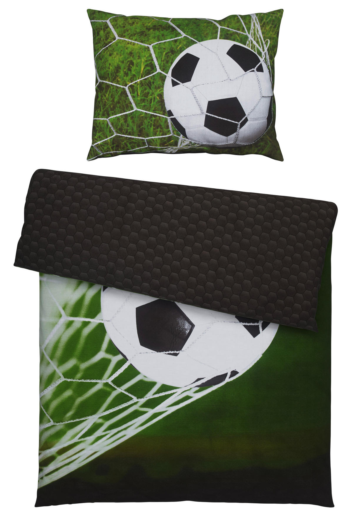 Fußball-Design ist als Eyecatcher perfekt mit den aktuellen Neigungen kompatibel. Bitte wenden: Bei dem Look mit unterschiedlicher Vorder- und Rückseite wird flexibel festgelegt, welche Ansicht gerade den Ton angeben darf. Top ausgestattet: Mit einem Deckenbezug sowie einer passenden Kissenhülle legt sich das 2-teilige Set mächtig ins Zeug.