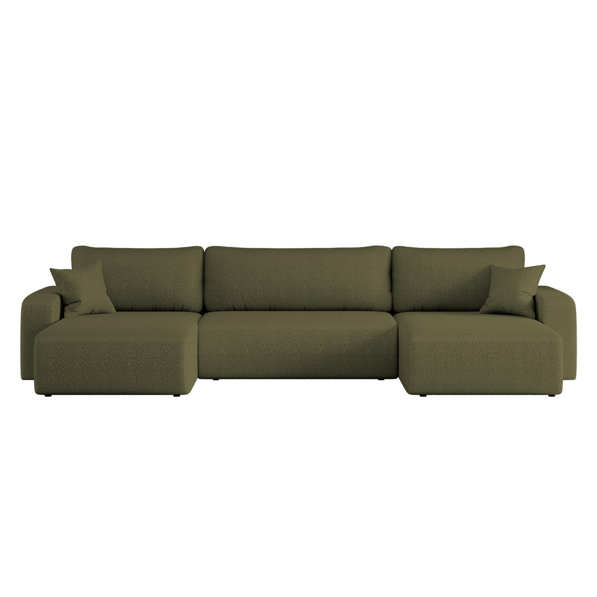 MILANO – Ecksofa mit Schlaffunktion und Bettkasten, U-Form, Stoff QUELLE Das Ecksofa MILANO U-Form überzeugt durch sein modernes, minimalistisches Design, das in jeden Raum passt. Es bietet nicht nur stilvollen Komfort, sondern auch praktische Funktionen – ideal für entspannte Stunden mit Familie und Freunden. Dank der robusten und stabilen Konstruktion ermöglicht es ein bequemes Schlafen. Die integrierte Schlaffunktion verwandelt das Sofa im Handumdrehen in ein Bett (Liegefläche: 266×130 cm), während der eingebaute Bettkasten zusätzlichen Stauraum für Bettwäsche und Kissen bietet. Das Sofa ist mit einfachen Entfaltungsmechanismen ausgestattet und ermöglicht eine universelle Nutzung – je nach Bedarf können Sie die Ausrichtung selbst wählen. Zwei im Lieferumfang enthaltene Kissen sowie die gleichfarbige Polsterung der Rückenlehne runden das harmonische Gesamtbild ab. Spezifikation: