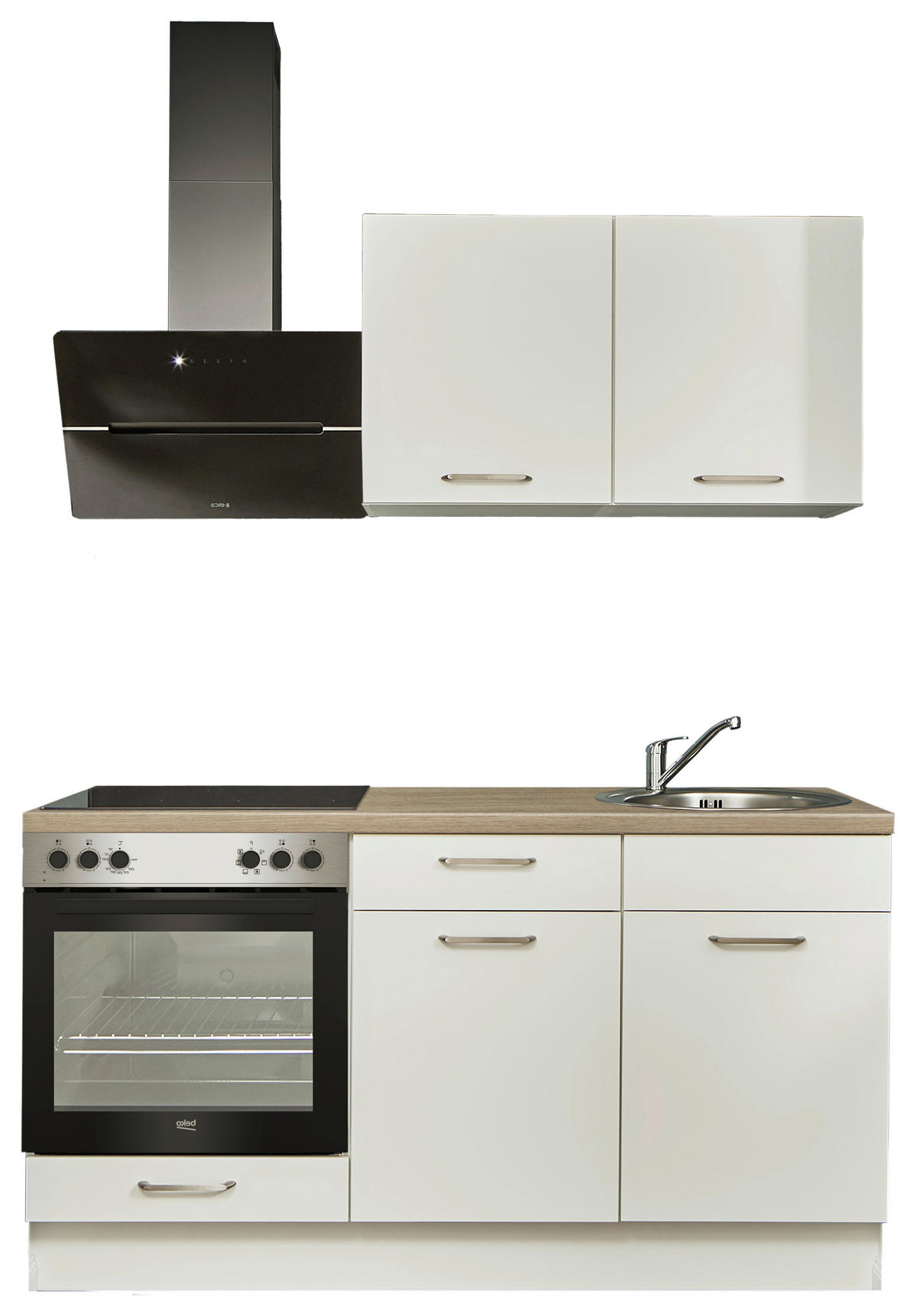 - Nicht im Lieferumfang enthalten: Armatur, Besteckeinsatz, E-Geräte, Nischenrückwand, Spüle, Ab- und Überlaufgarnitur, Dekoration, Anschlussset